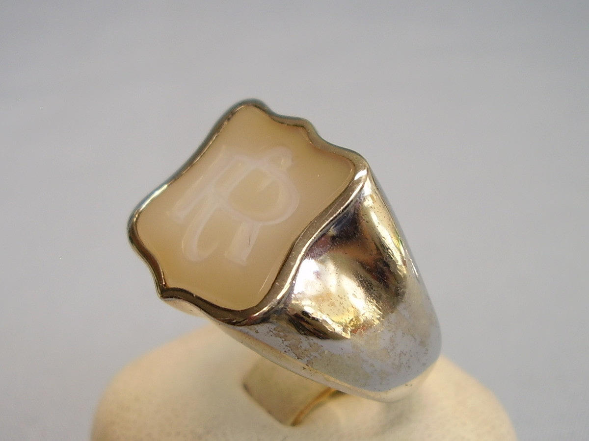 Der Ringkopf ist in Wappenform ausgeführt und mit einem hellen Calzedon besetzt.