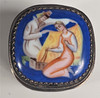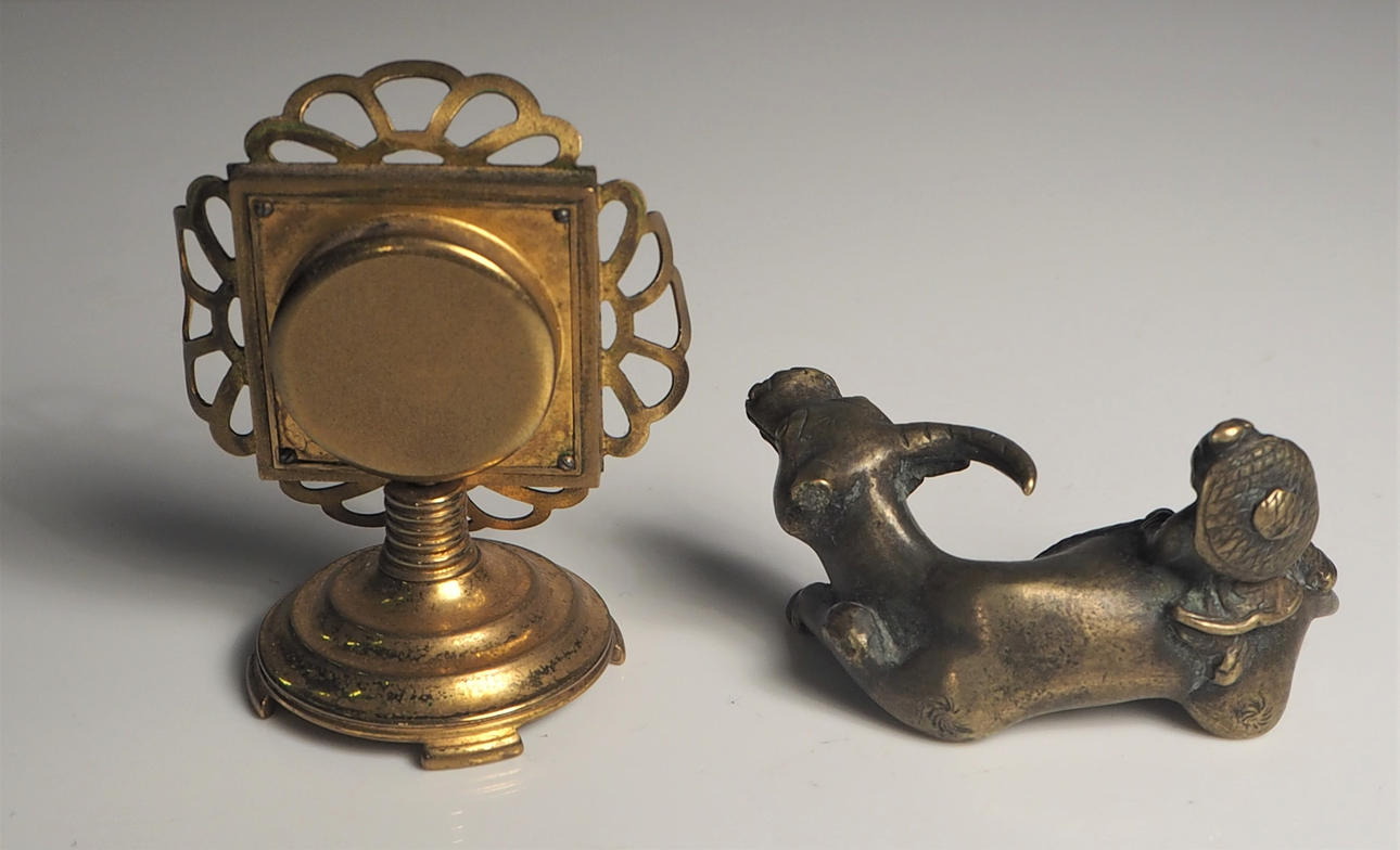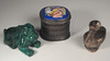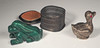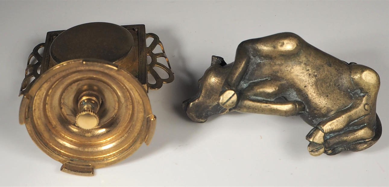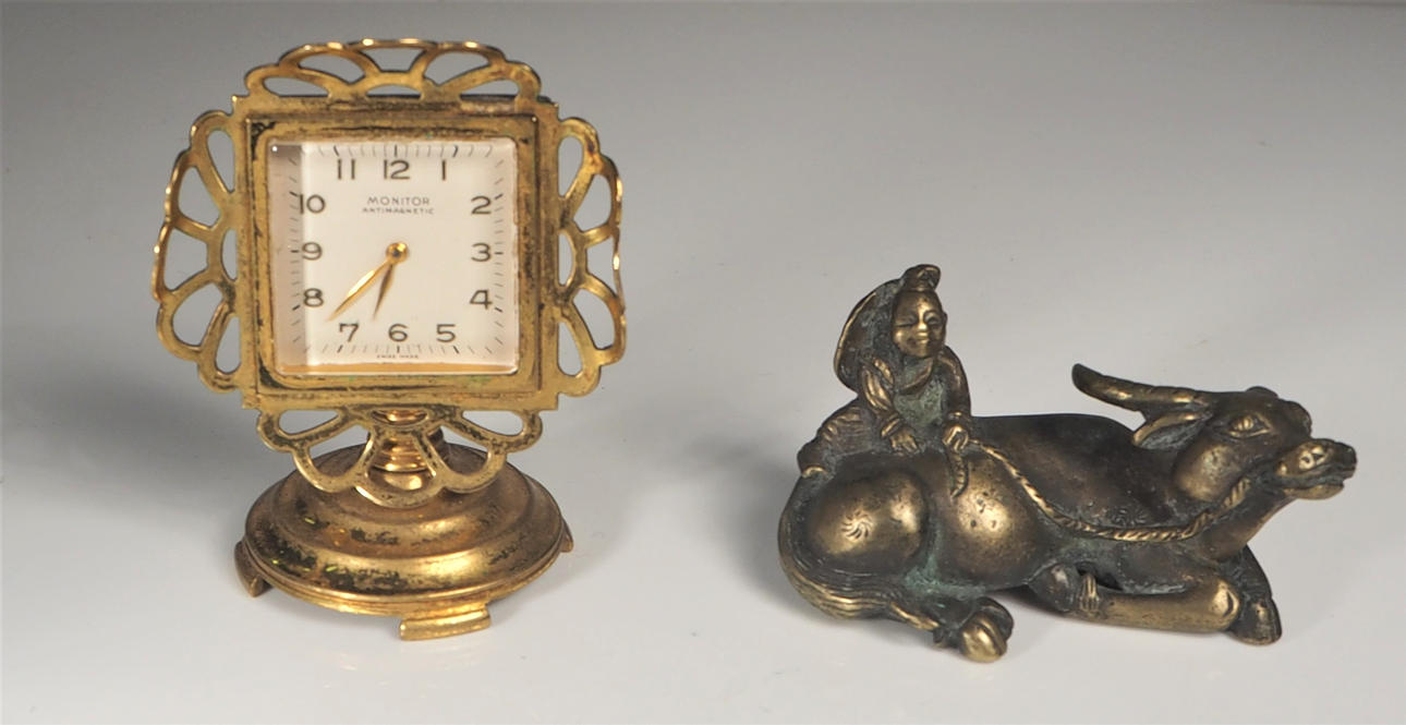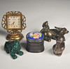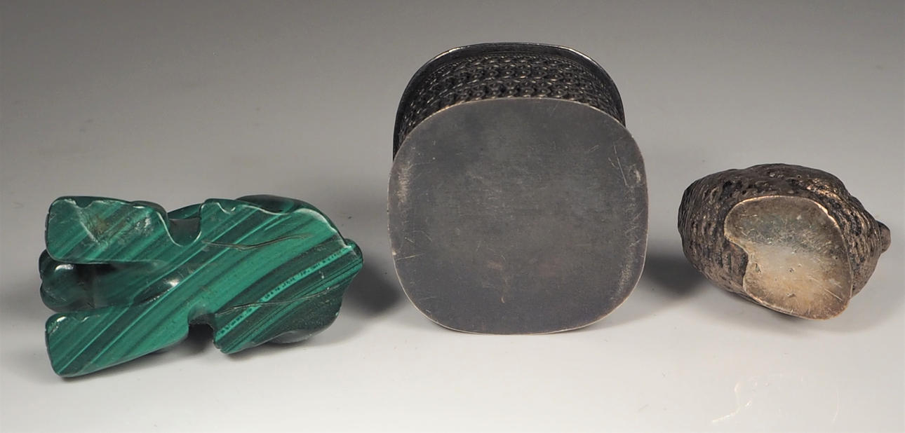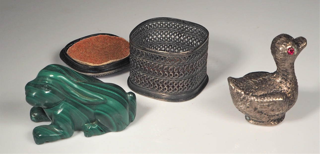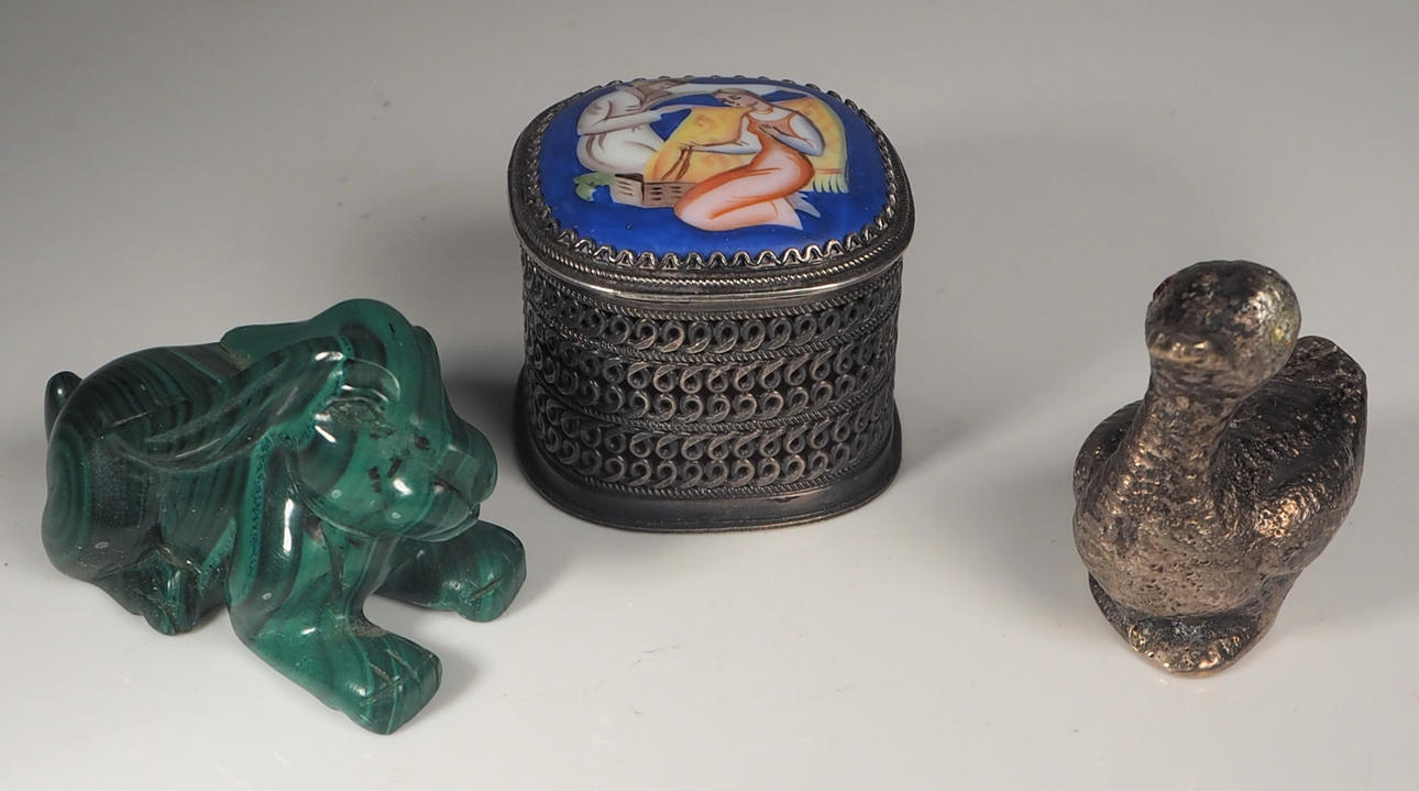 Box, Silber mit Emailledeckel, Höhe 2,5 cm Vogel in Silber, Höhe 3 cm Uhr, Höhe 5,5 cm Ochse, Messing, Länge 5,5 cm Hase, Malachit, Länge 4 cm.