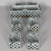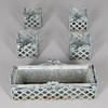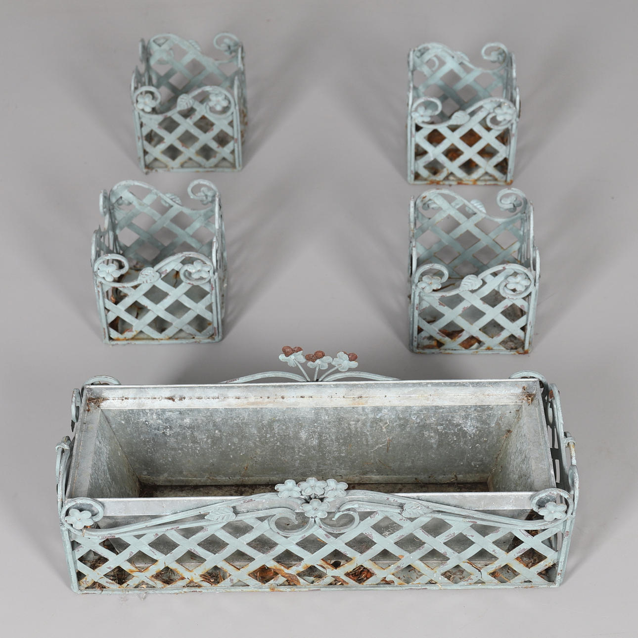 kürzlich hergestellt, mit grüner Lackierung und zugehörigem Einsatz, insgesamt 19 cm hoch, 56 cm breit, 19 cm tief, zusammen mit vier passenden Pflanzgefäßen im gleichen Muster, 15 cm hoch, 16 cm im Quadrat, (5).