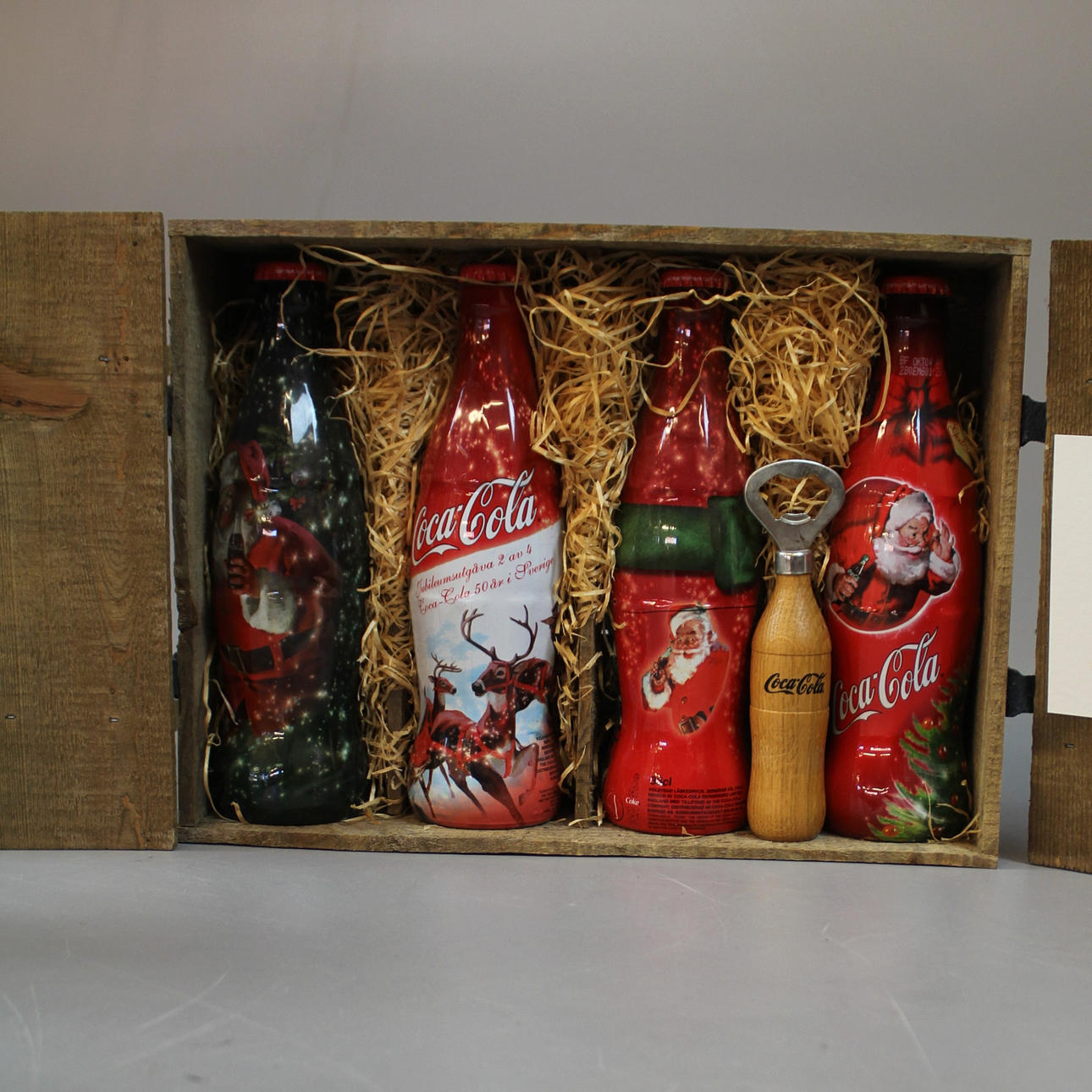 1 Wanduhr, 1 Eiskübel, 2 Glasflaschen mit dazugehörigen Strohhalmen, 2 Glasflaschen 1 Liter, 1 Holzkiste mit 4 Glasweihnachtsflaschen und Kapselheber.