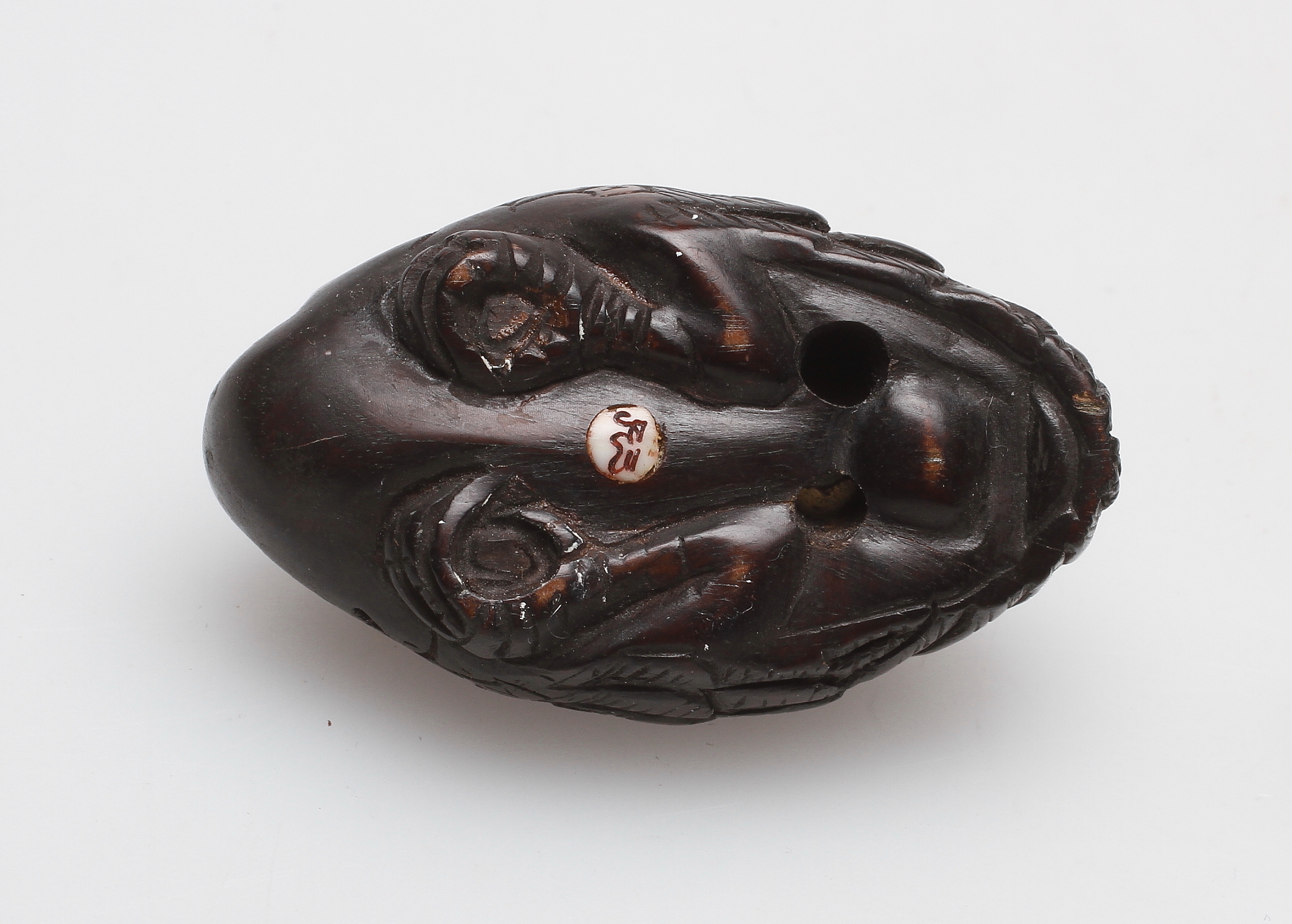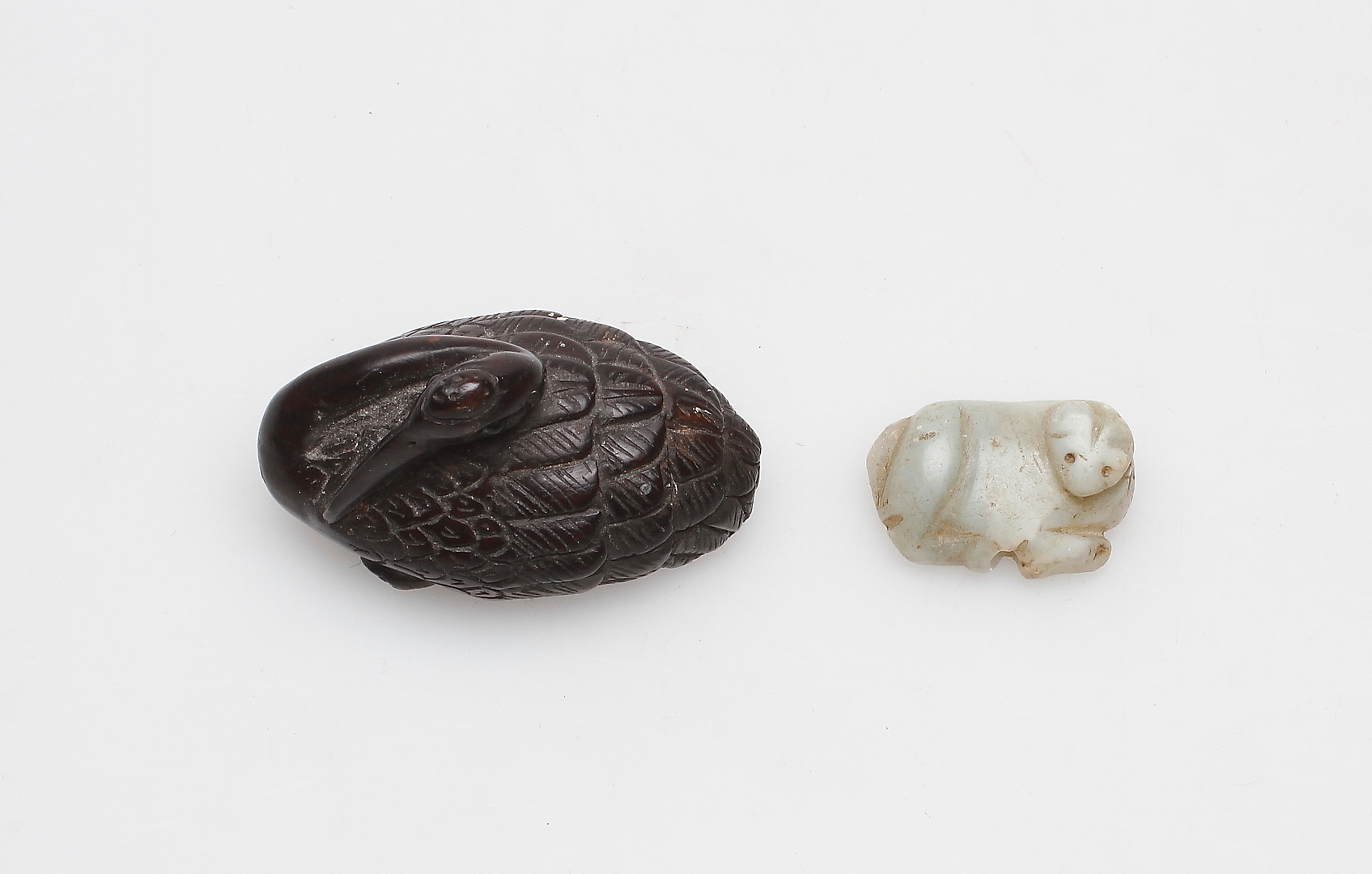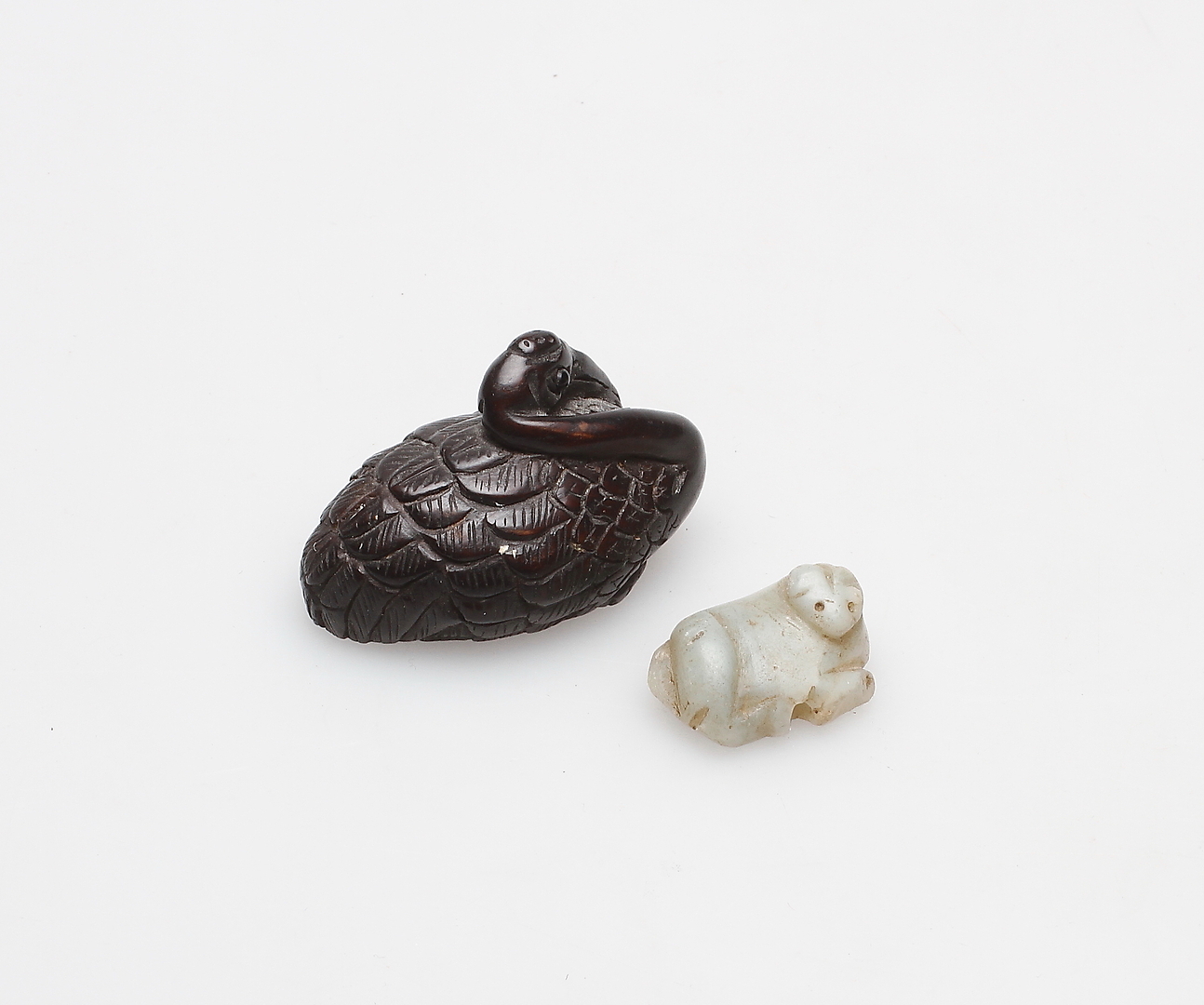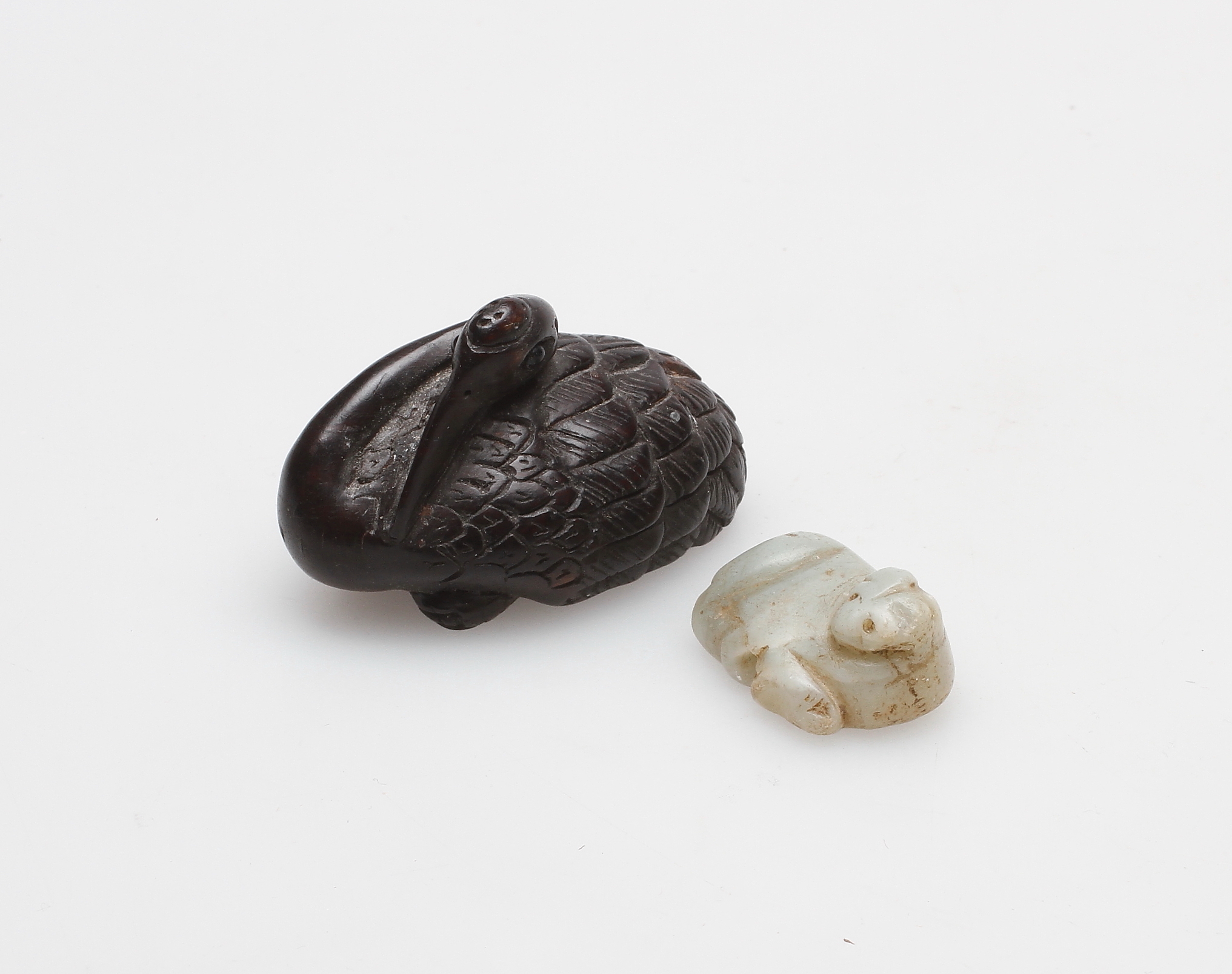 149877. NETSUKE, 2 Stück, Stein und Holz, orientalisch.
