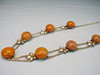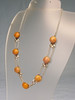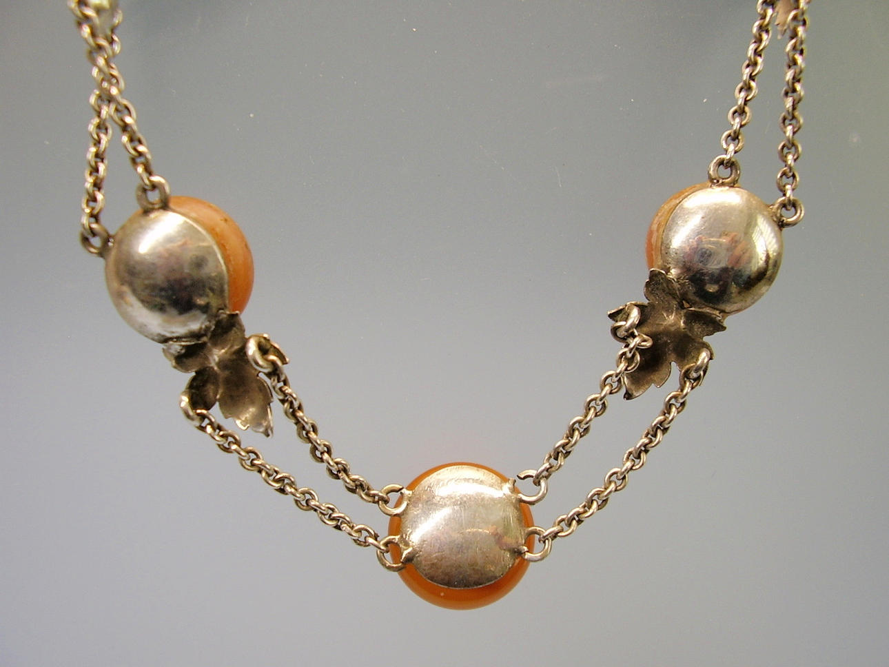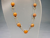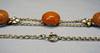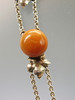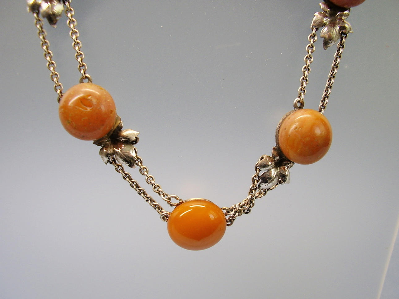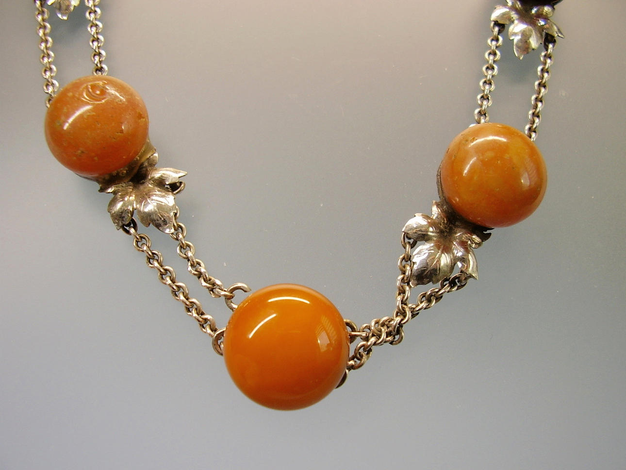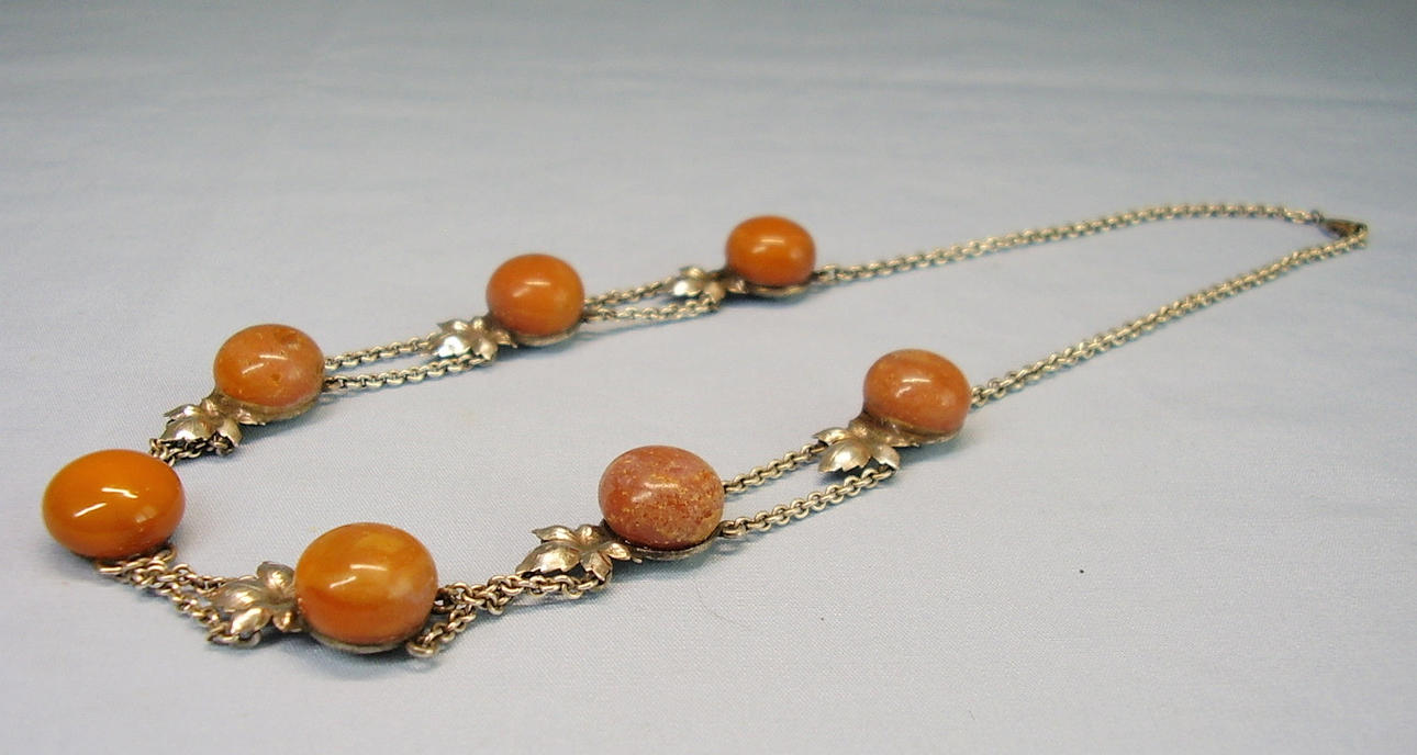 Es ist besetzt mit 7 rundlichen opaken Natur-Bernstein Boutons in alter Patina. Mit handgearbeiteten Blättern zwischen jeweils zwei ErbskettenSträngen, die beim letzten Bernstein-Bouton in einen Strang übergehen, der mit einem Federring geschlossen wird.
