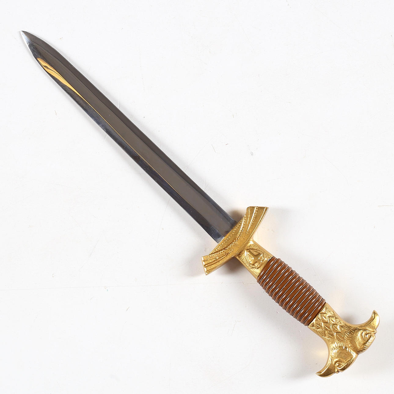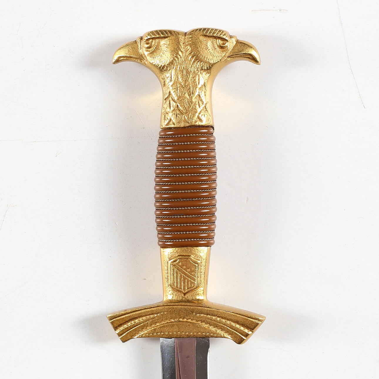 Griff aus Messing mit Adlerkopf und Schild, Spulenwicklung aus gedrehtem Metalldraht am Griff.