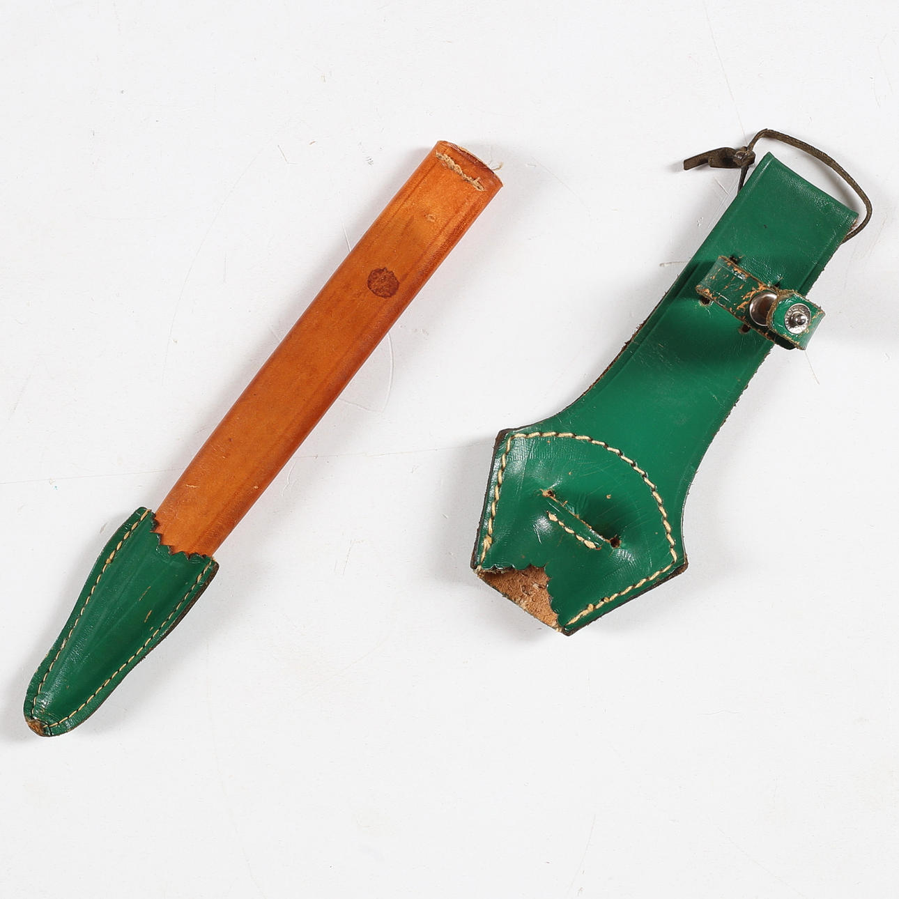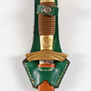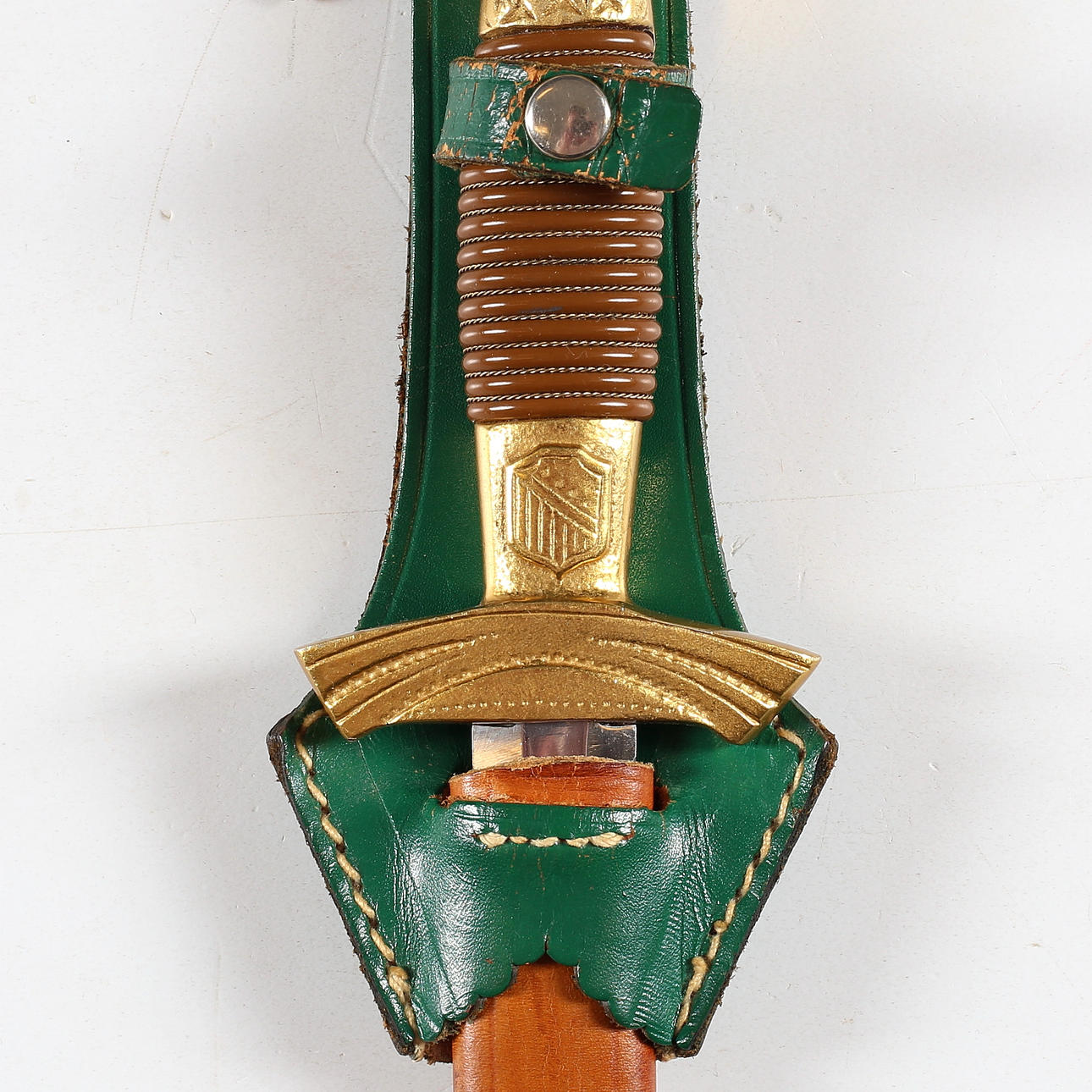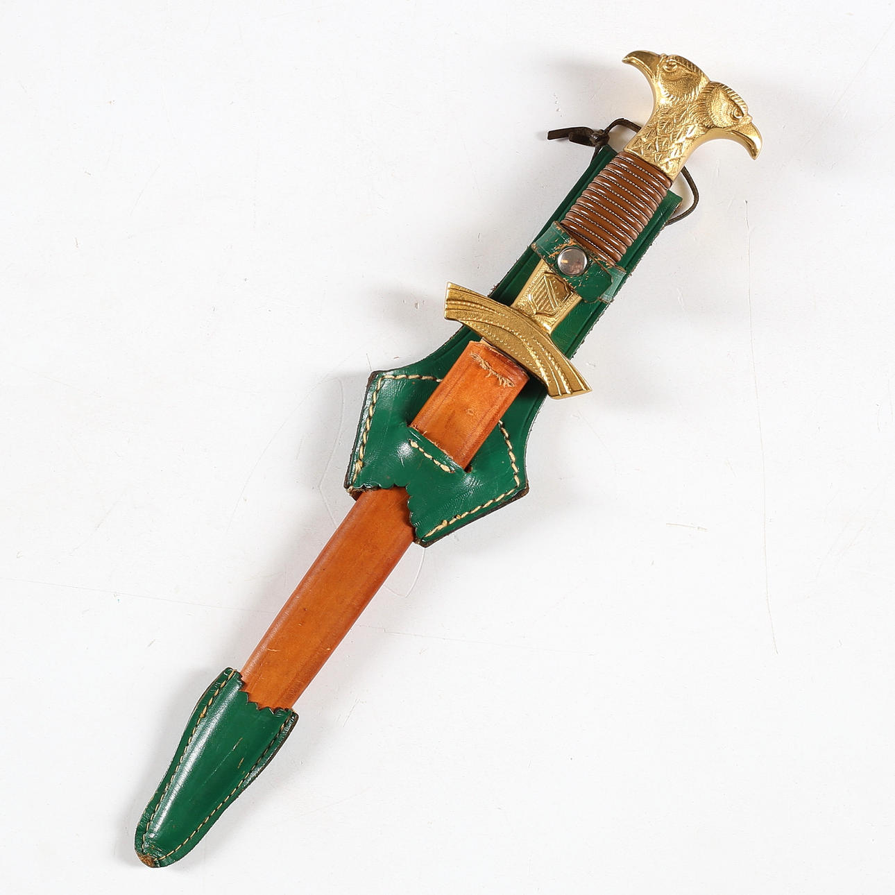 Guter Zustand, trockene Risse im Leder an der Halterung, grünes Lederdetail lose an der Scheide.