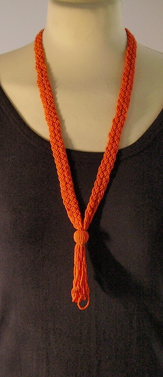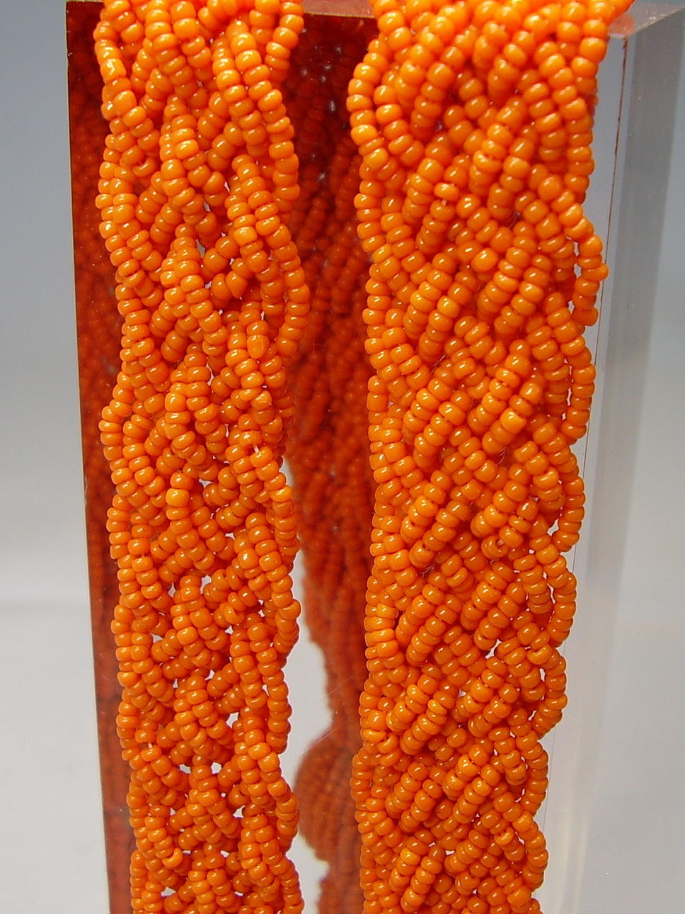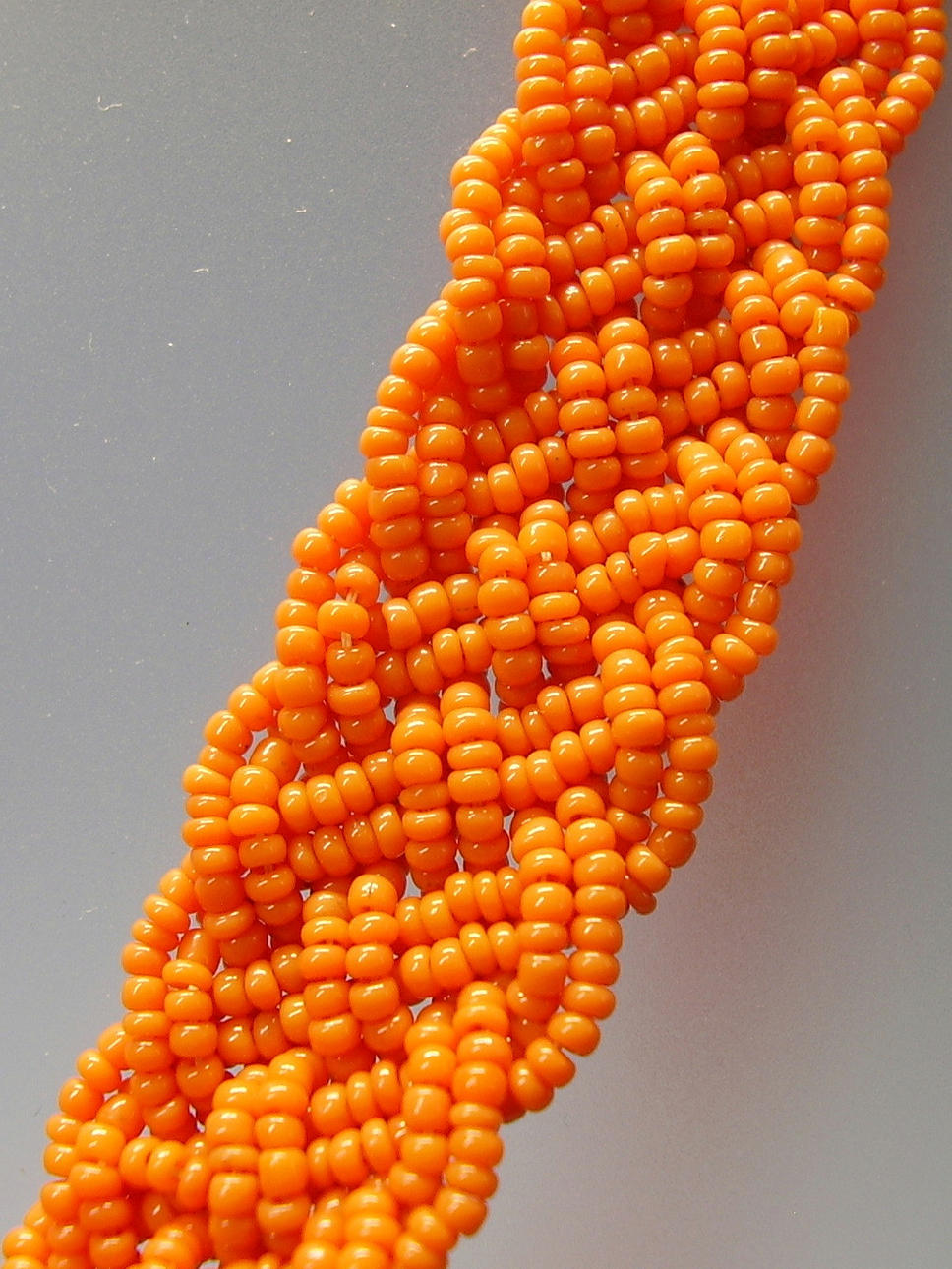 Es ist als 12 reihiges Geflecht-Band gearbeitet, aus feinsten, korallefarbenen, mundgeblasenen Glasperlchen.