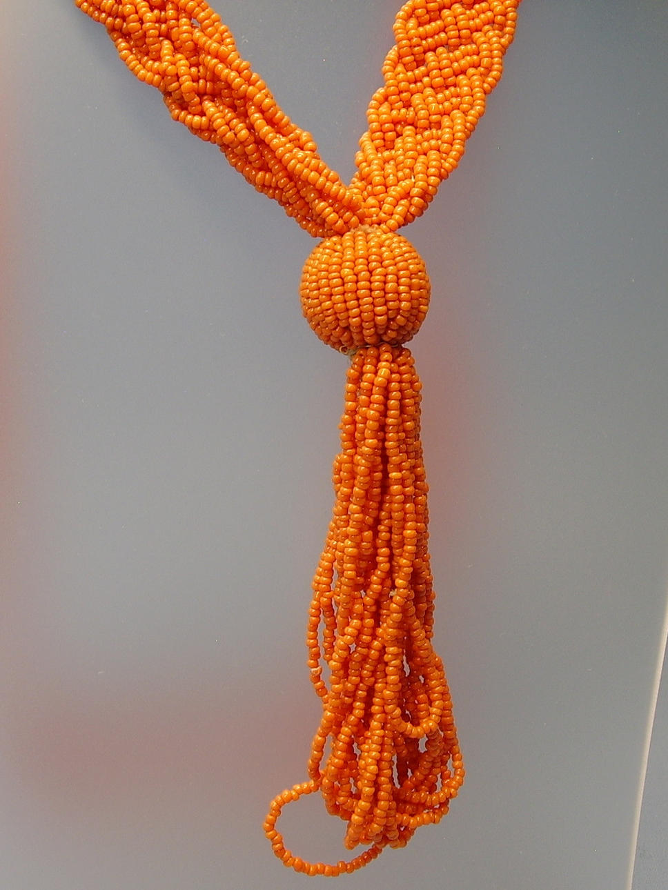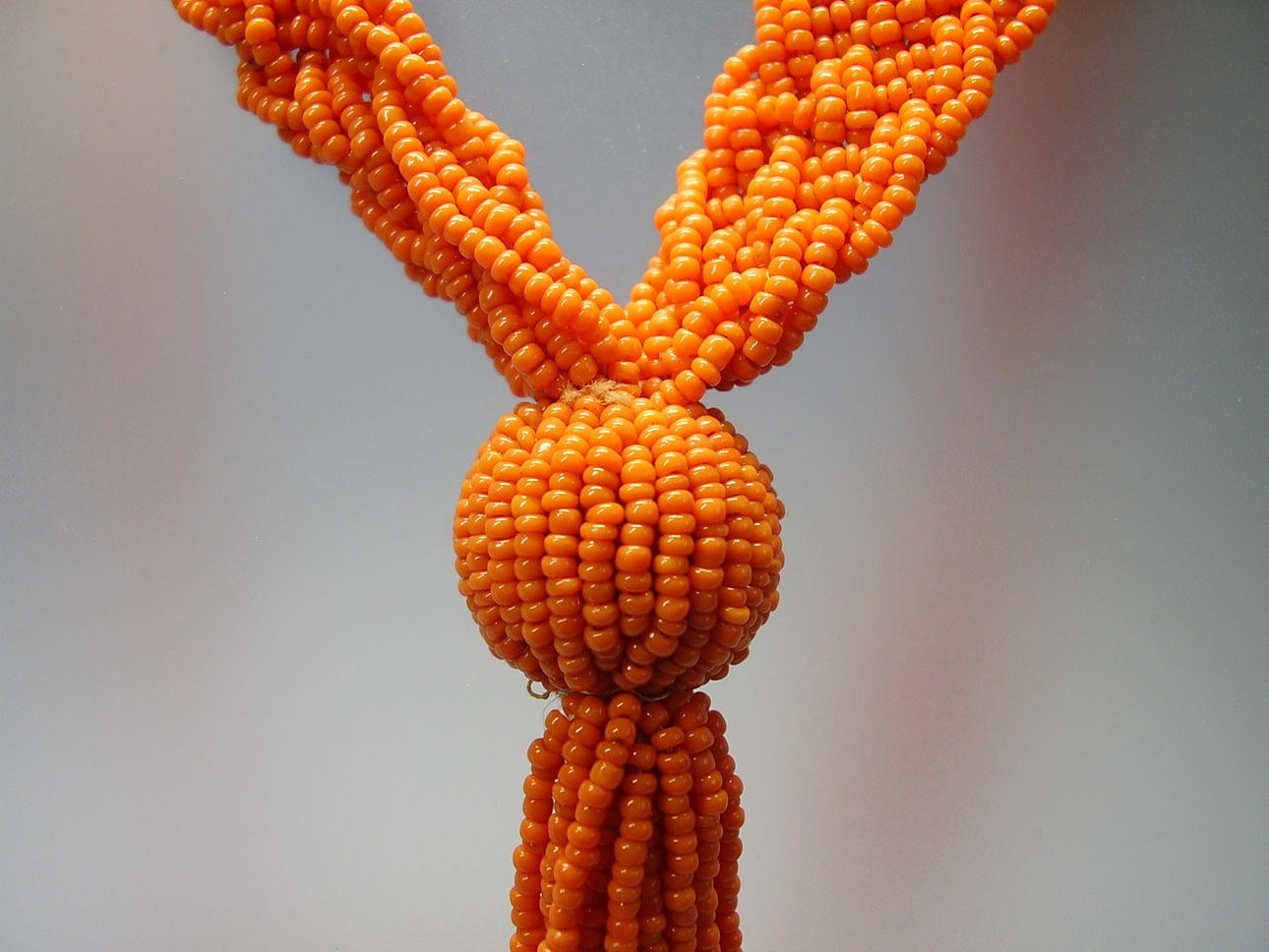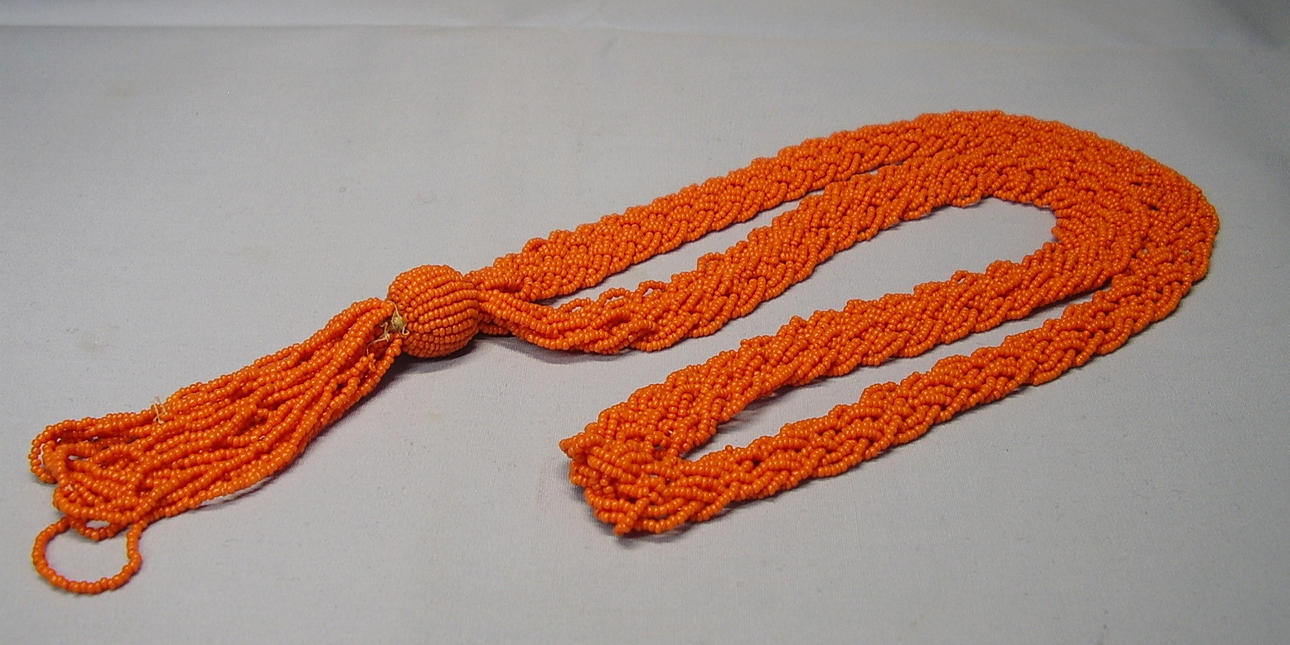 Es ist als 12 reihiges Geflecht-Band gearbeitet, aus feinsten, korallefarbenen, mundgeblasenen Glasperlchen.