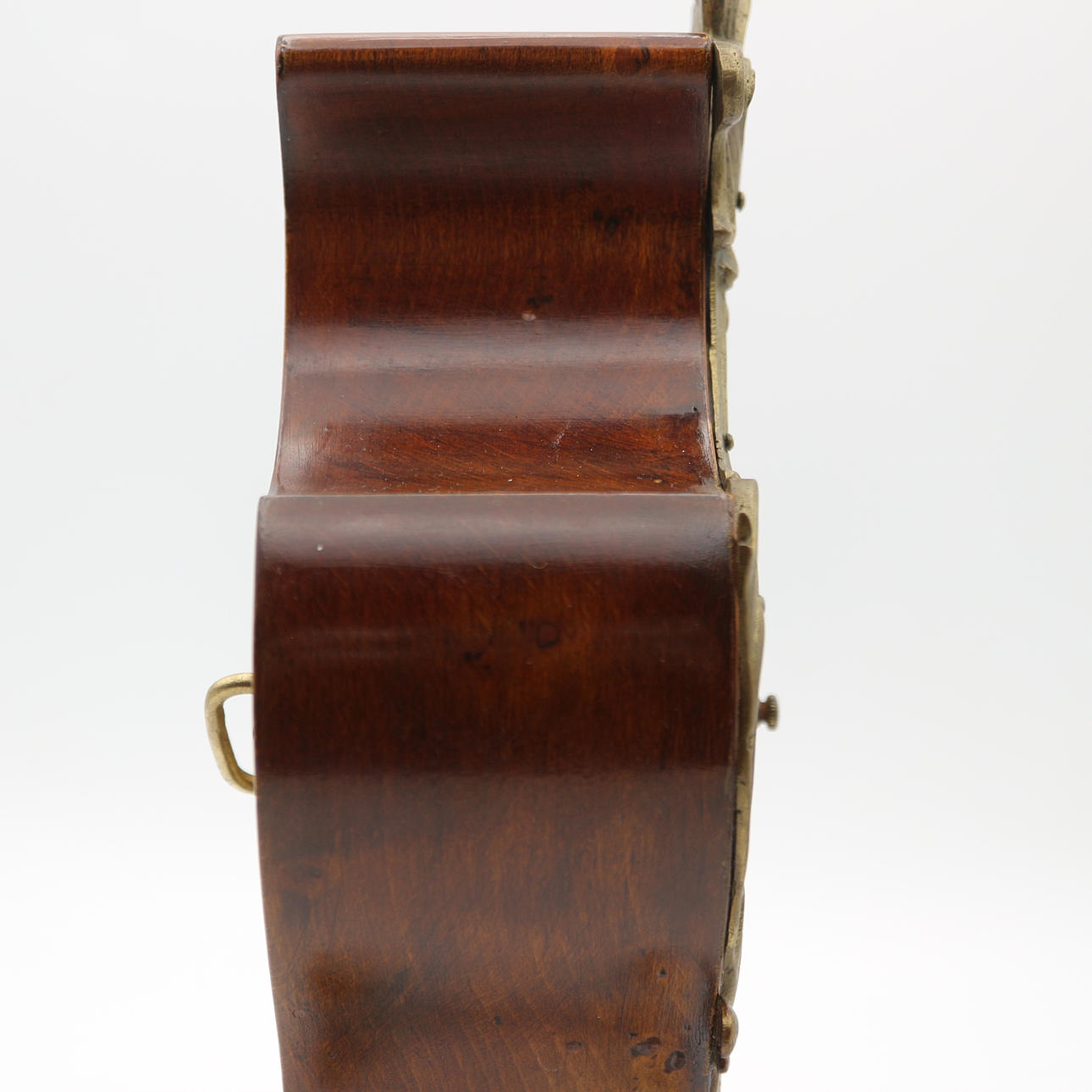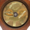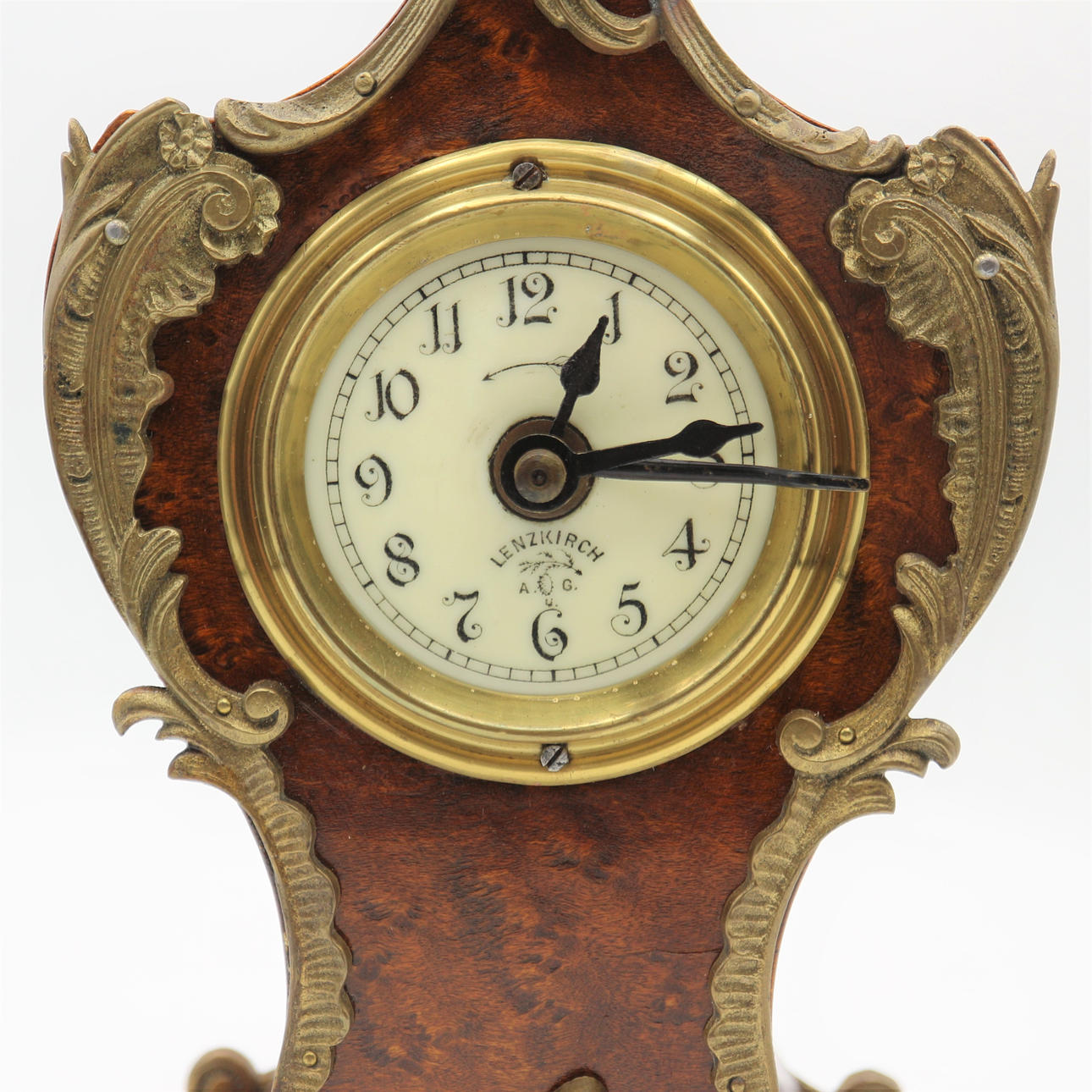 Jugendstil Uhr von Lenzkirch im Originalzustand, mit Wecker, schönes Nussbaum Gehäuse, verziert mit floralen Jugendstil Bronzen, Drechsel signiert, B 14729, Maße: 13,5 x 24,5 cm.