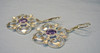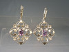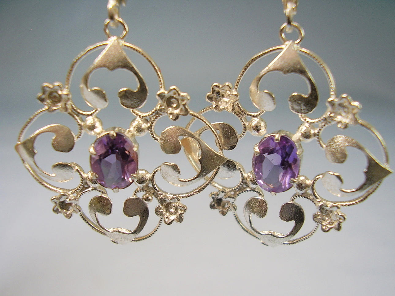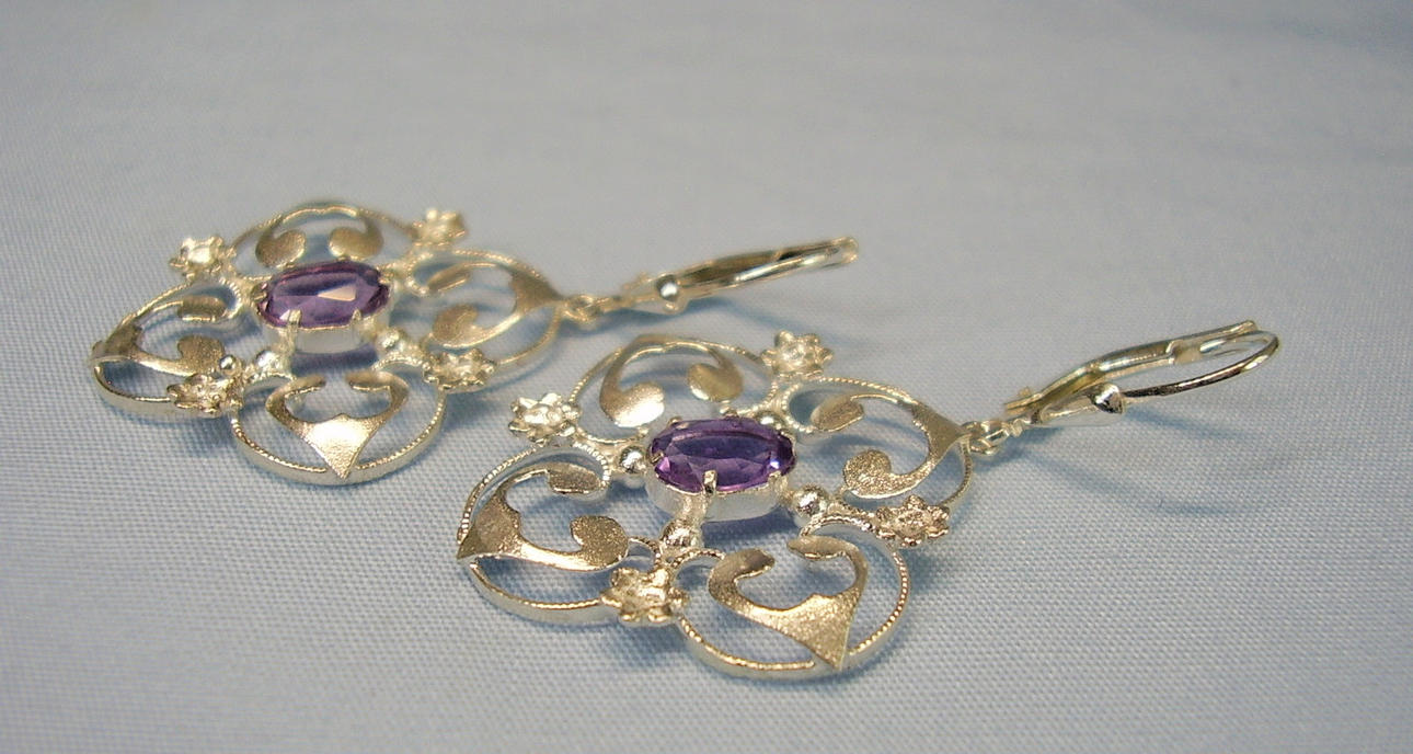 Sie sind mit Klapp-Ohrbügeln ausgestattet, darunter hängen durchbrochen gearbeitete und ornamental verzierte Abhängungen mit oval facettierten Amethysten.