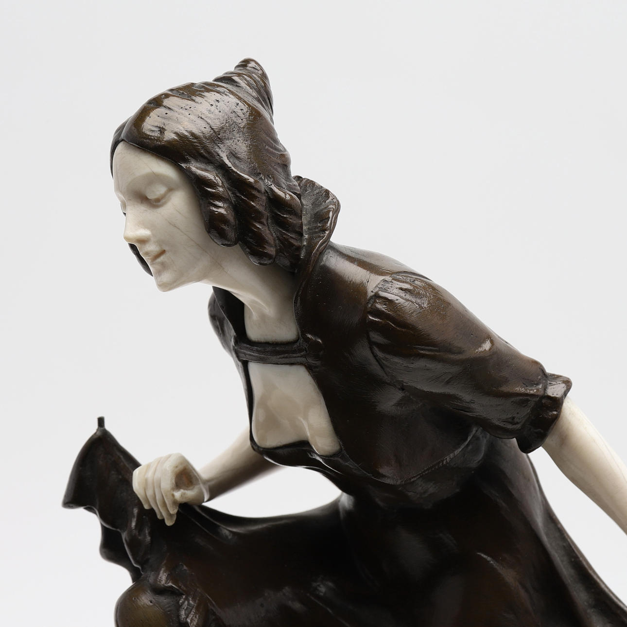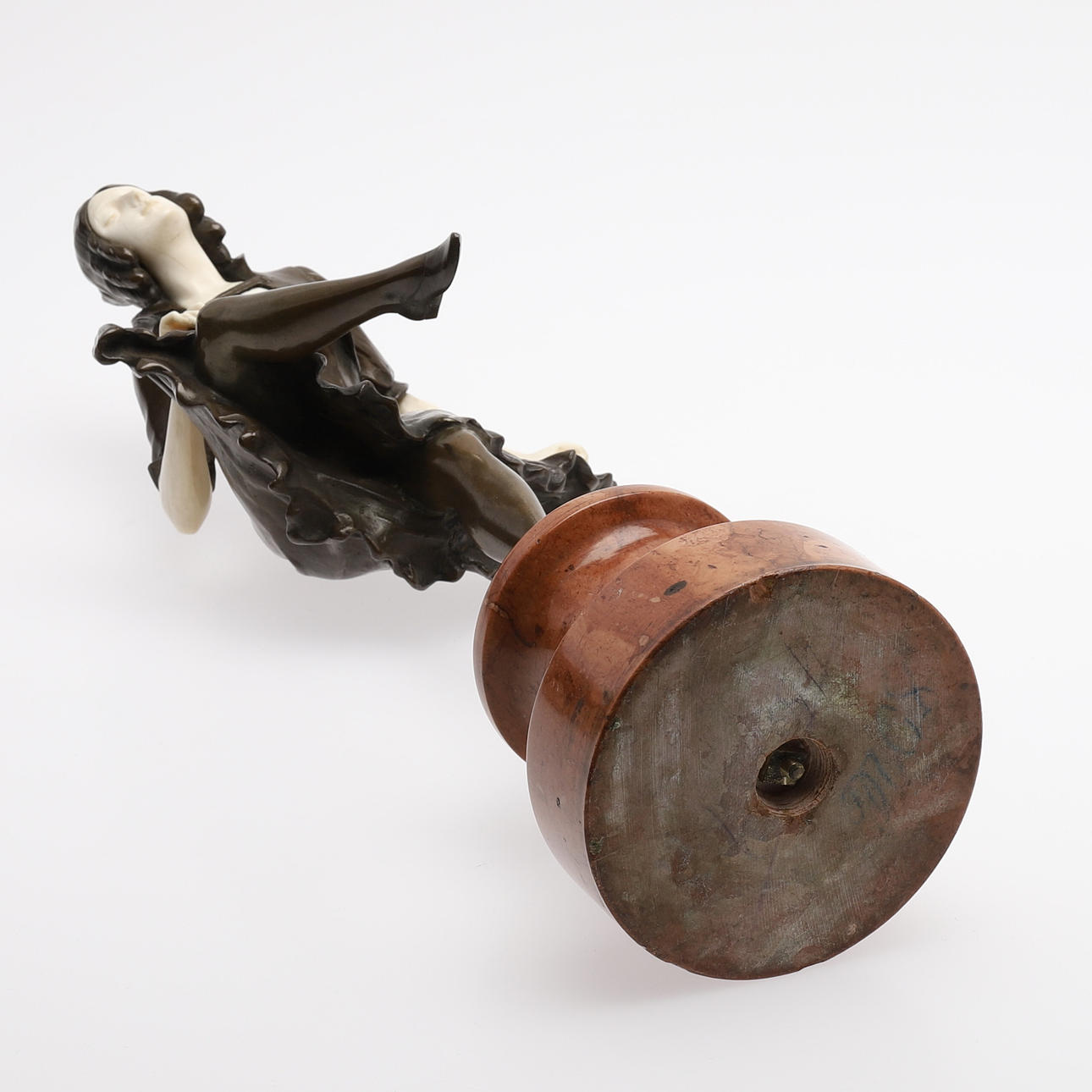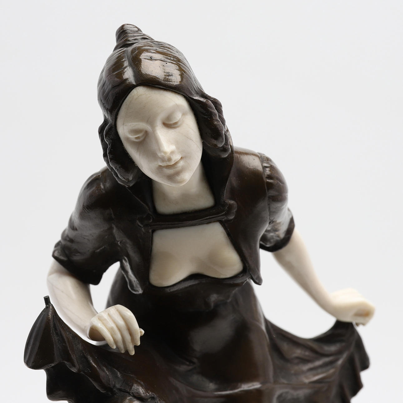 Skulptur in Form einer Tänzerin, patinierte Bronze und Elfenbein, Höhe 30 cm, Marmorsockel, um 1900, Gesamthöhe 40 cm.