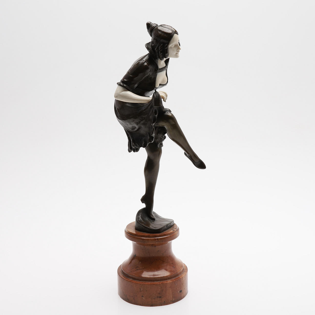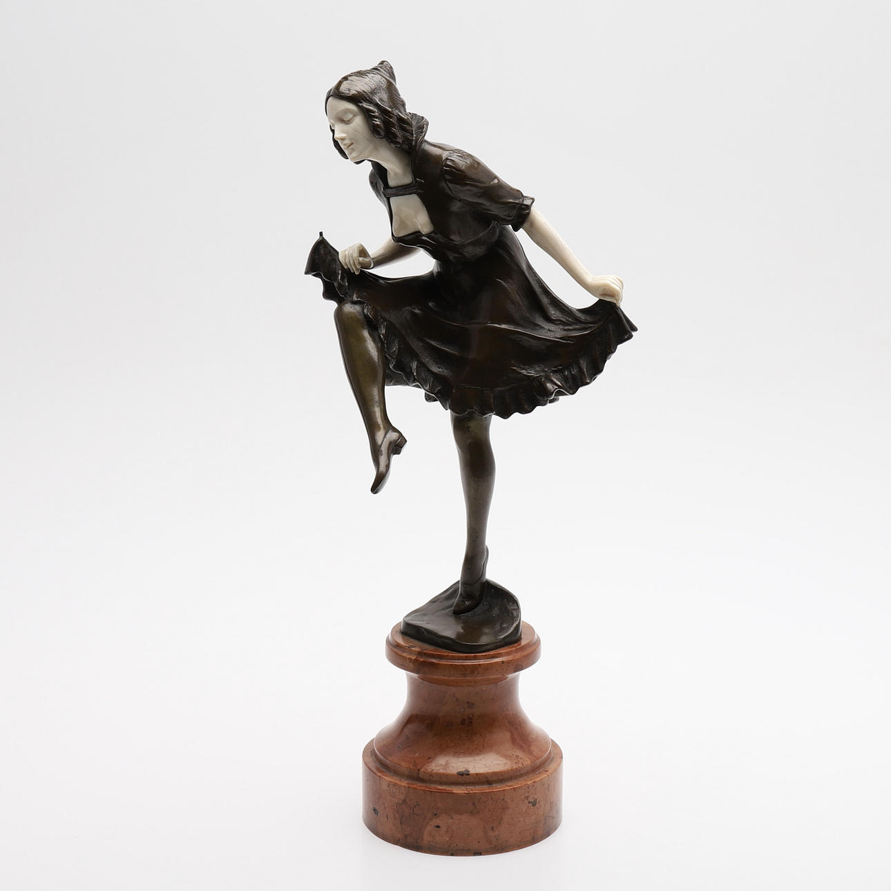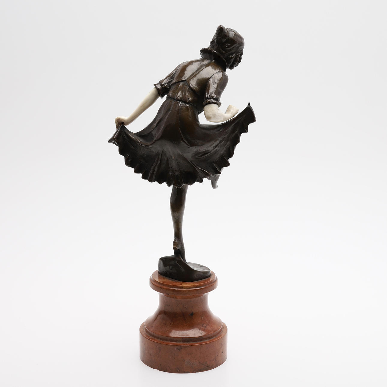 Skulptur in Form einer Tänzerin, patinierte Bronze und Elfenbein, Höhe 30 cm, Marmorsockel, um 1900, Gesamthöhe 40 cm.