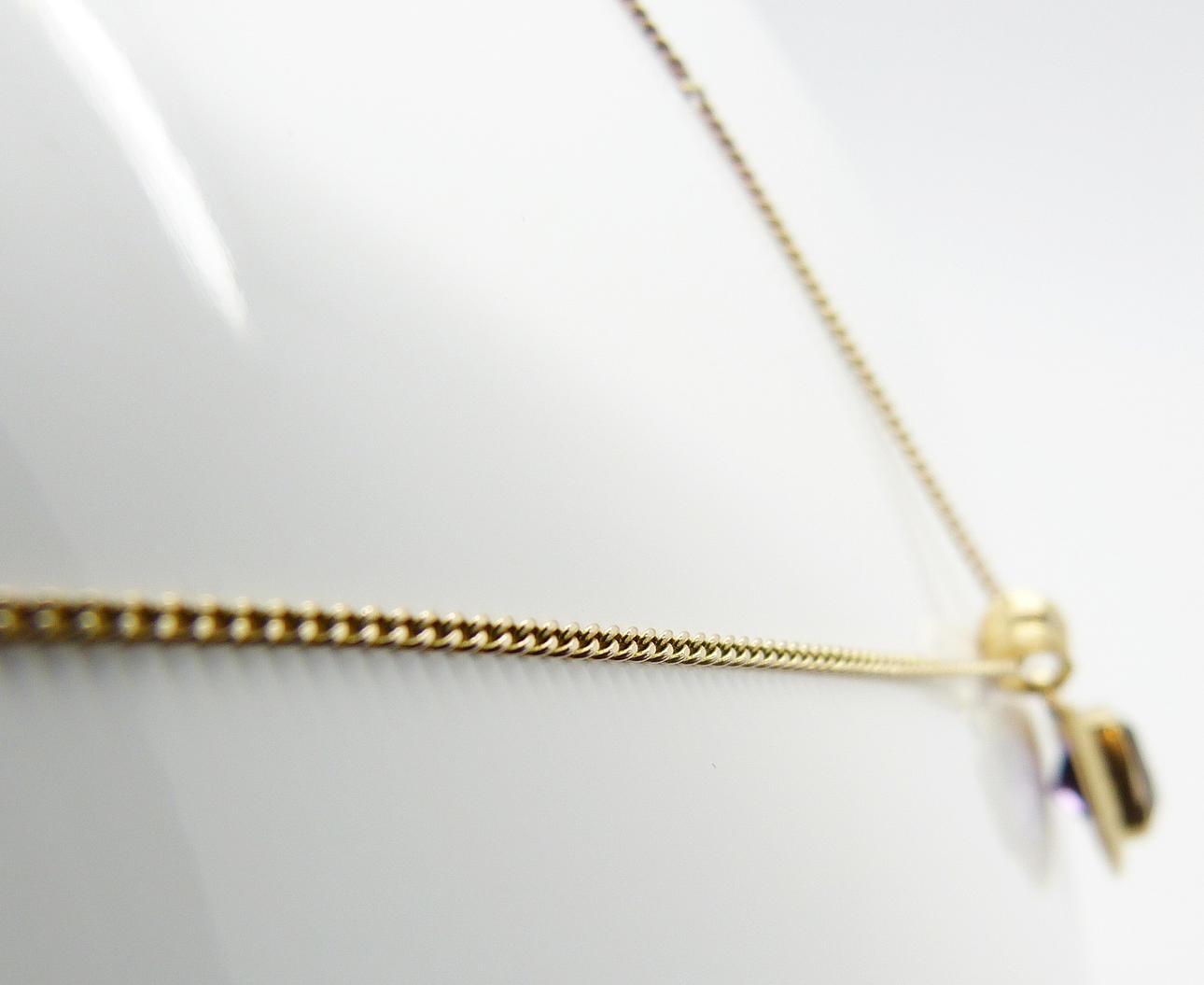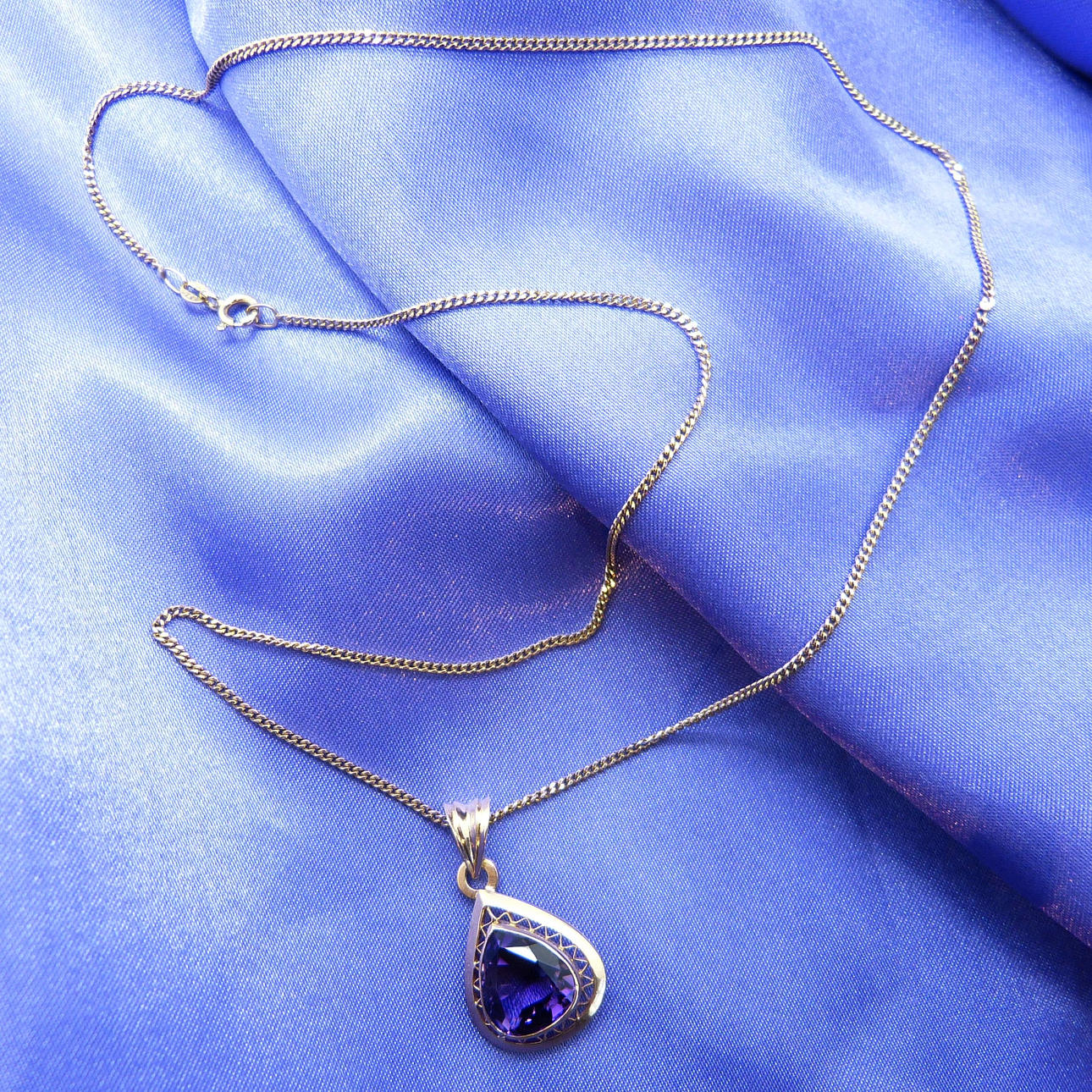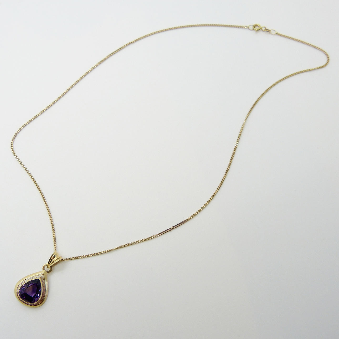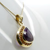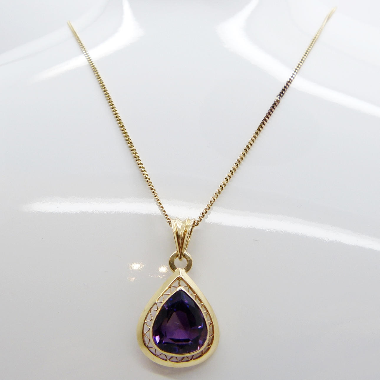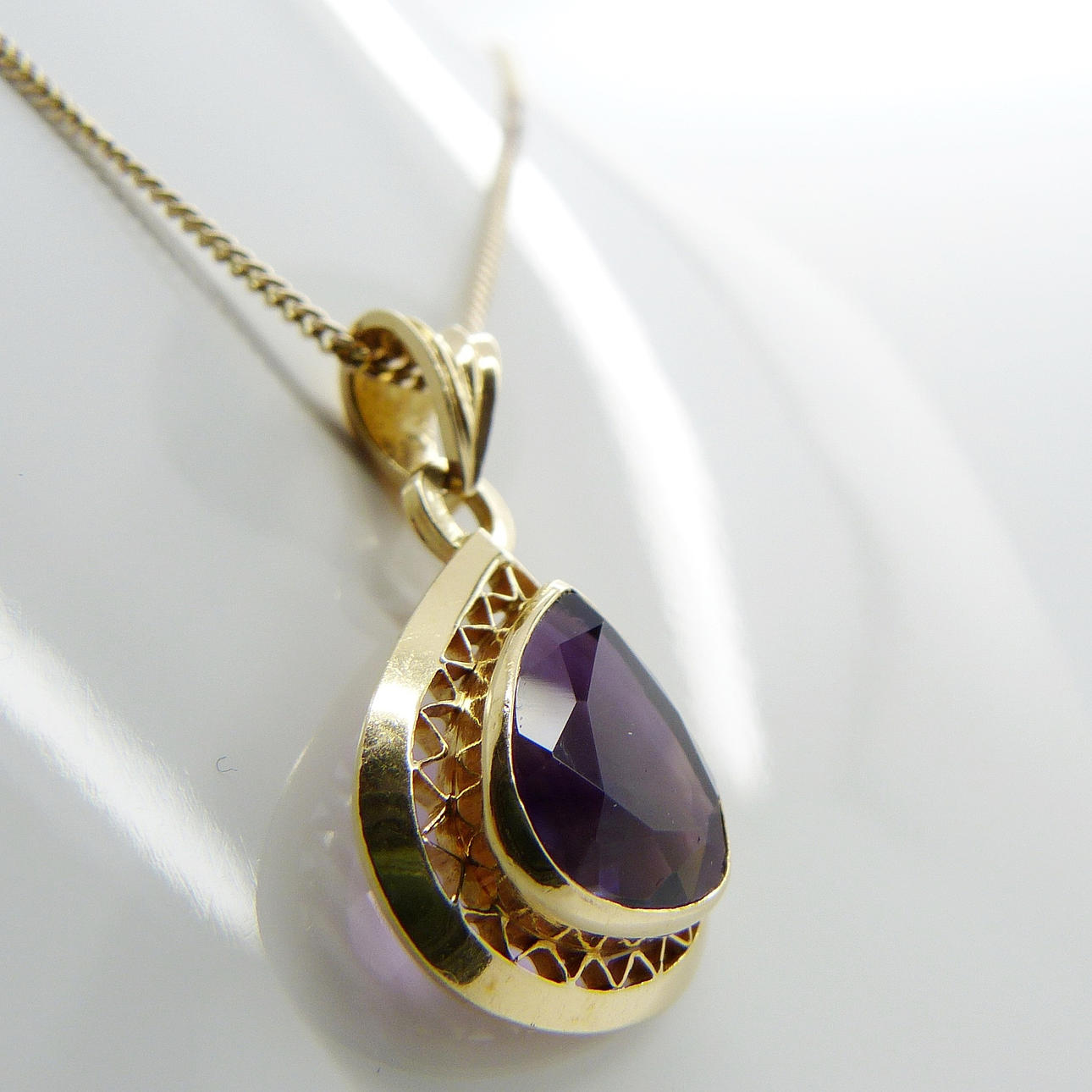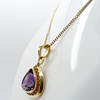 Ein hochkarätiger Amethyst-Anhänger aus Gelbgold, der an einer 9-karätigen Gelbgoldkette hängt.