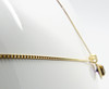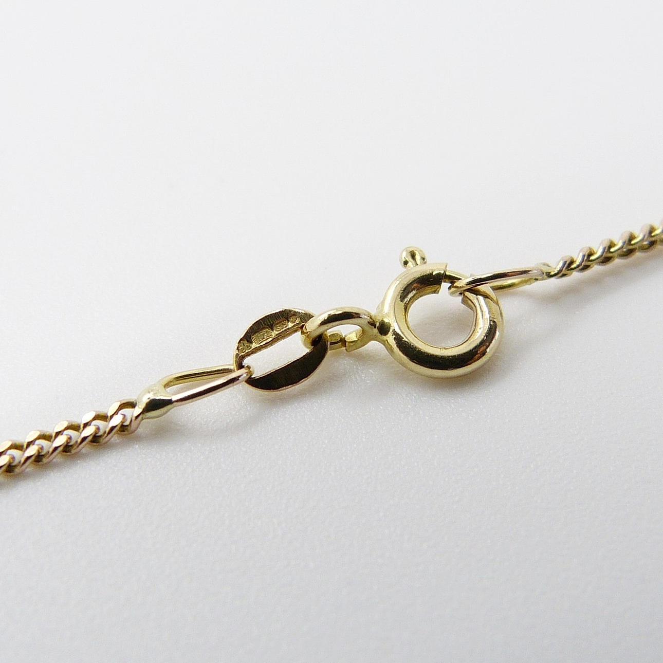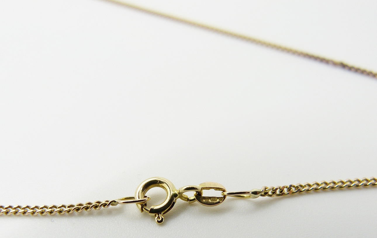 Die Kette ist aus 9 Karat Gelbgold (punziert). Der Anhänger ist als hochkarätiges Gelbgold geprüft.