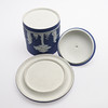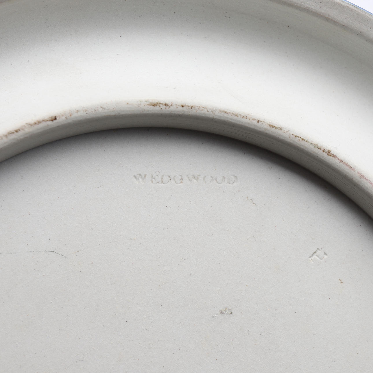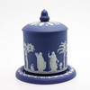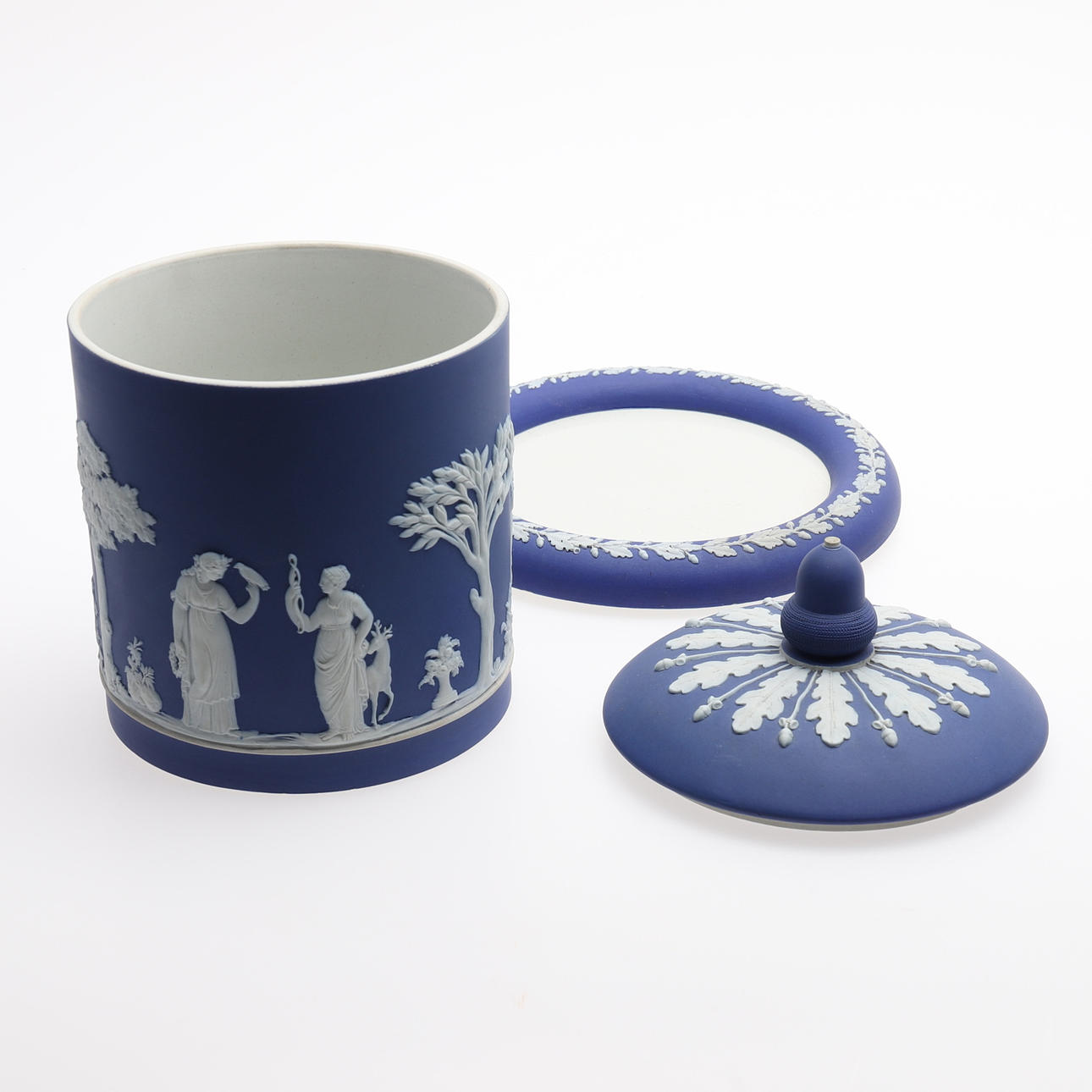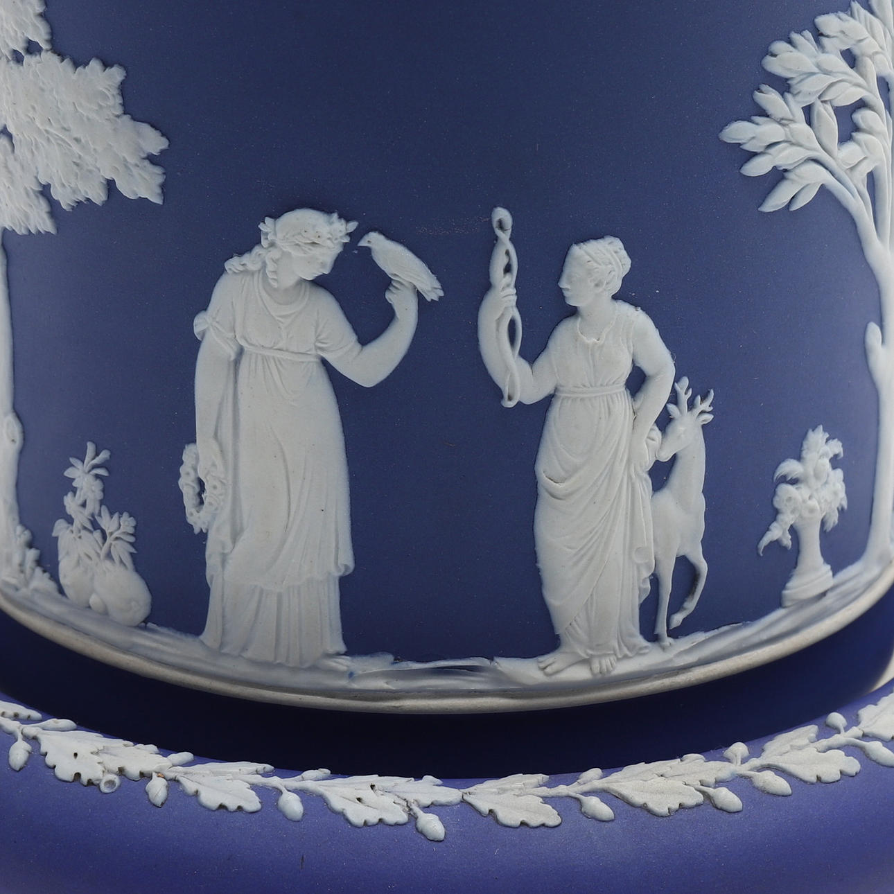 Jaspis-Porzellan mit antiken Relieffiguren in Weiß auf hellblauem Hintergrund, gestempelt Wedgwood, 19. Jahrhundert, Höhe 21 cm.