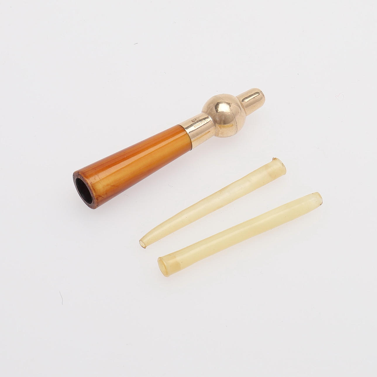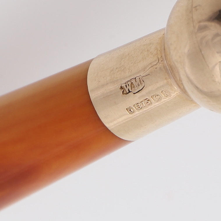 9 Karat Gold, Meerschaum und Silber, punziert Birmingham Anfang des 20. Jahrhunderts, Gehäusehöhe 7 cm.