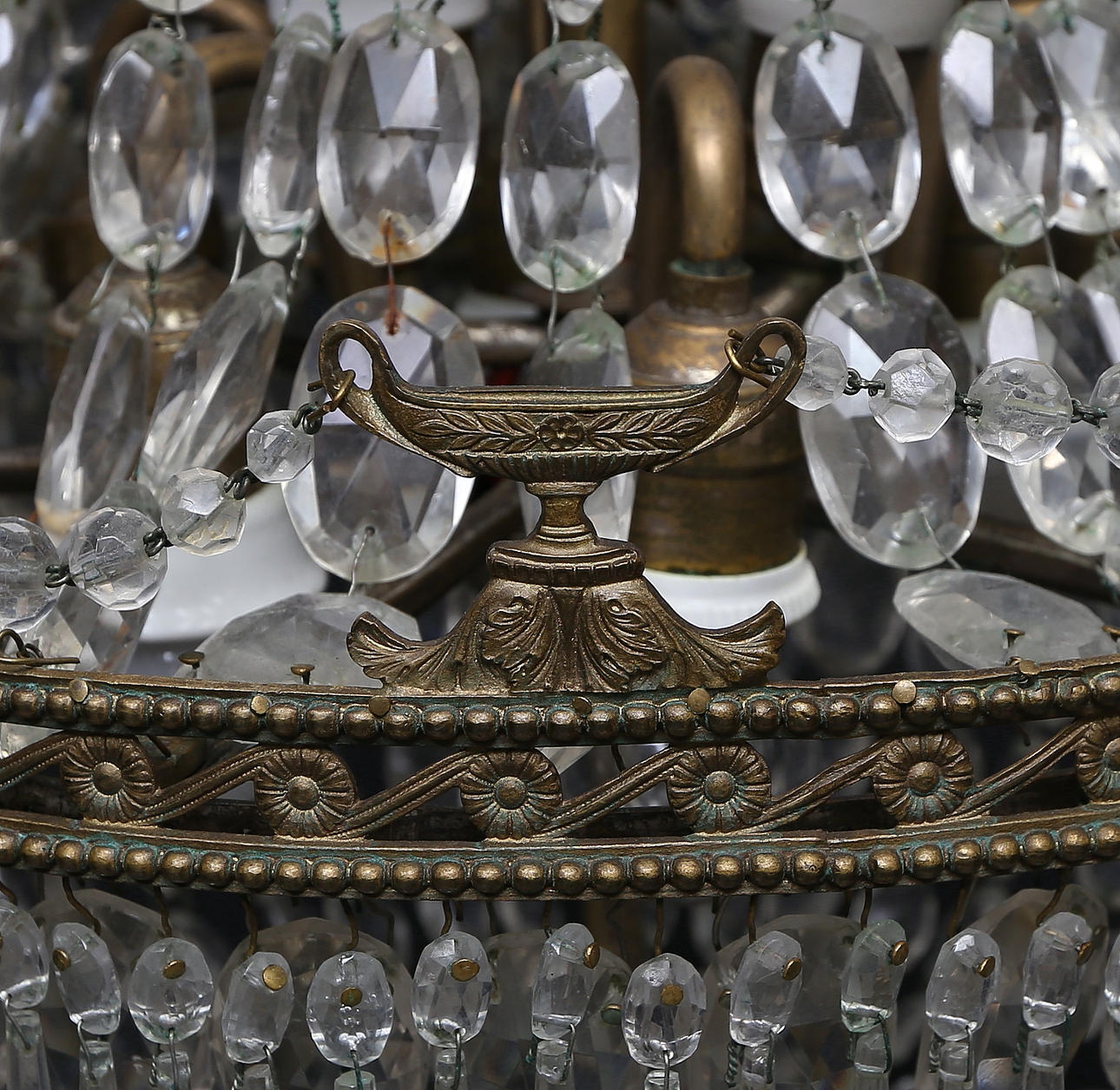 Messing, besetzt mit Prismen, Dekoration ua mit Tazzen, 8 Lichtpunkte.