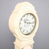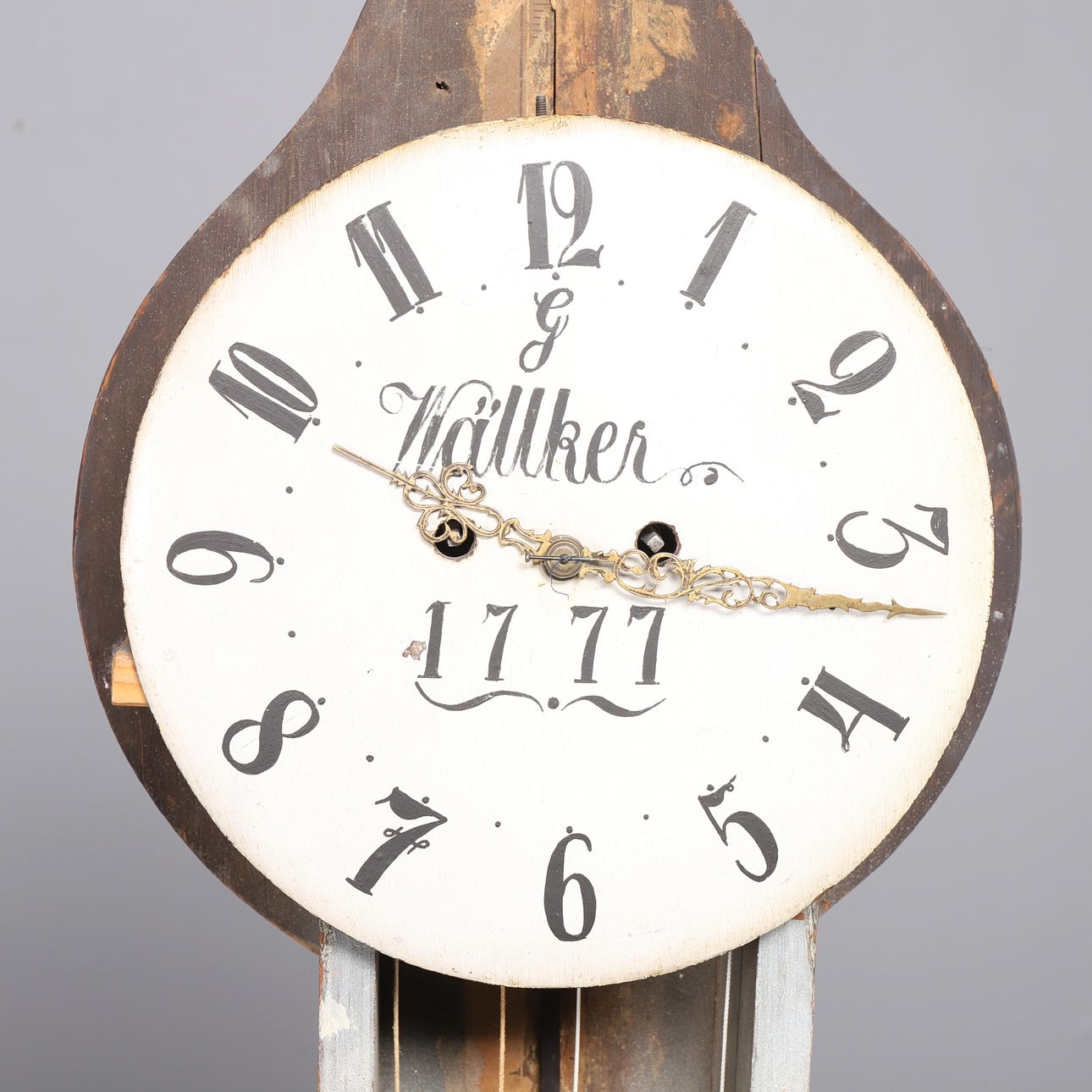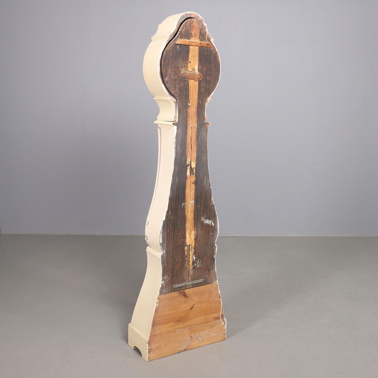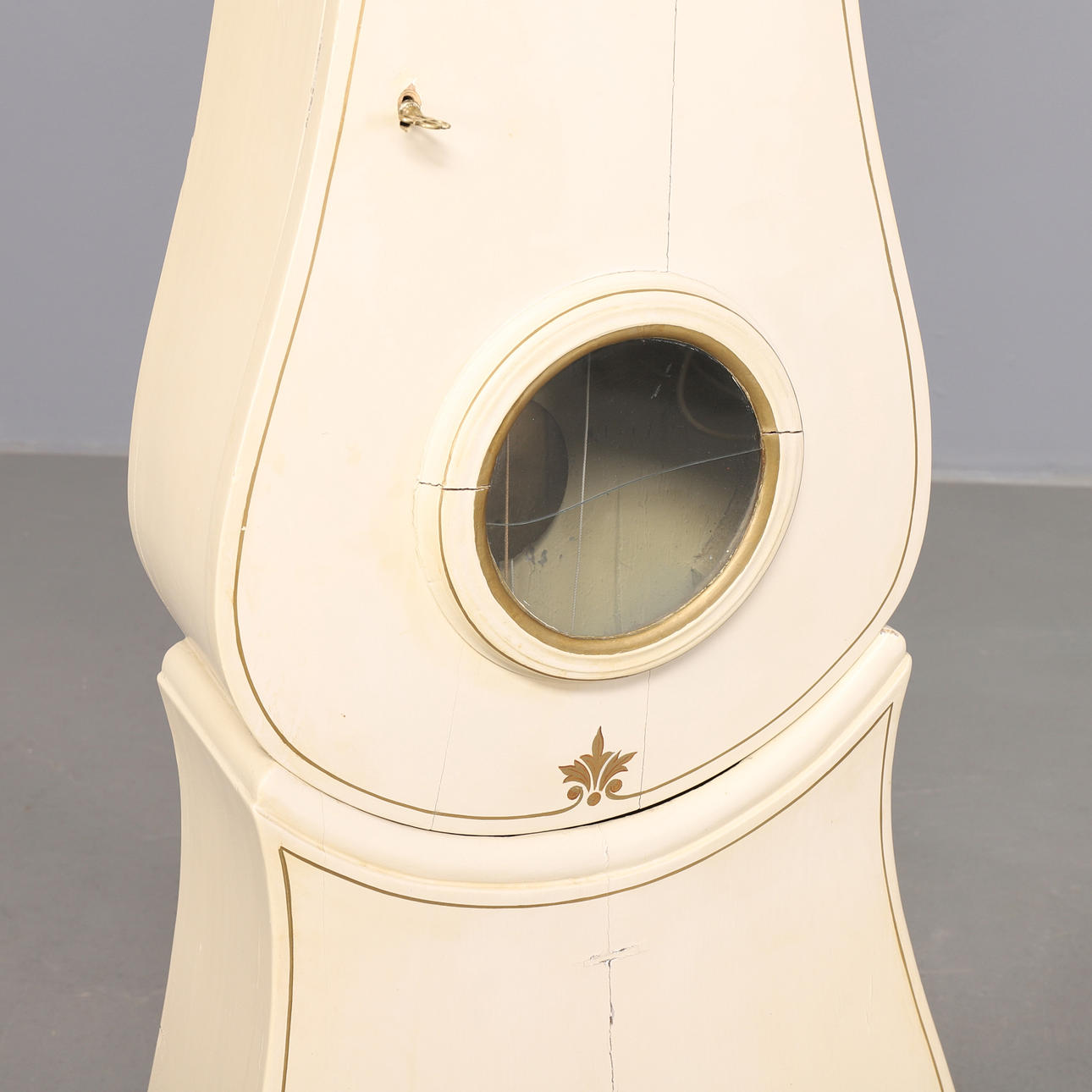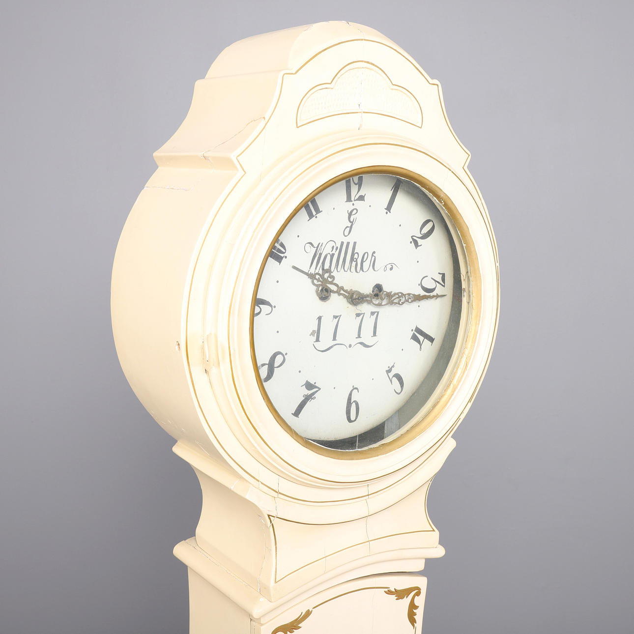 Weiß lackiertes Gehäuse, Zifferblatt gemarkt Wällker 1777, Höhe ca. 204 cm, Breite 43 cm. Inklusive Pendel, Schlüssel und Senkblei.