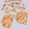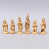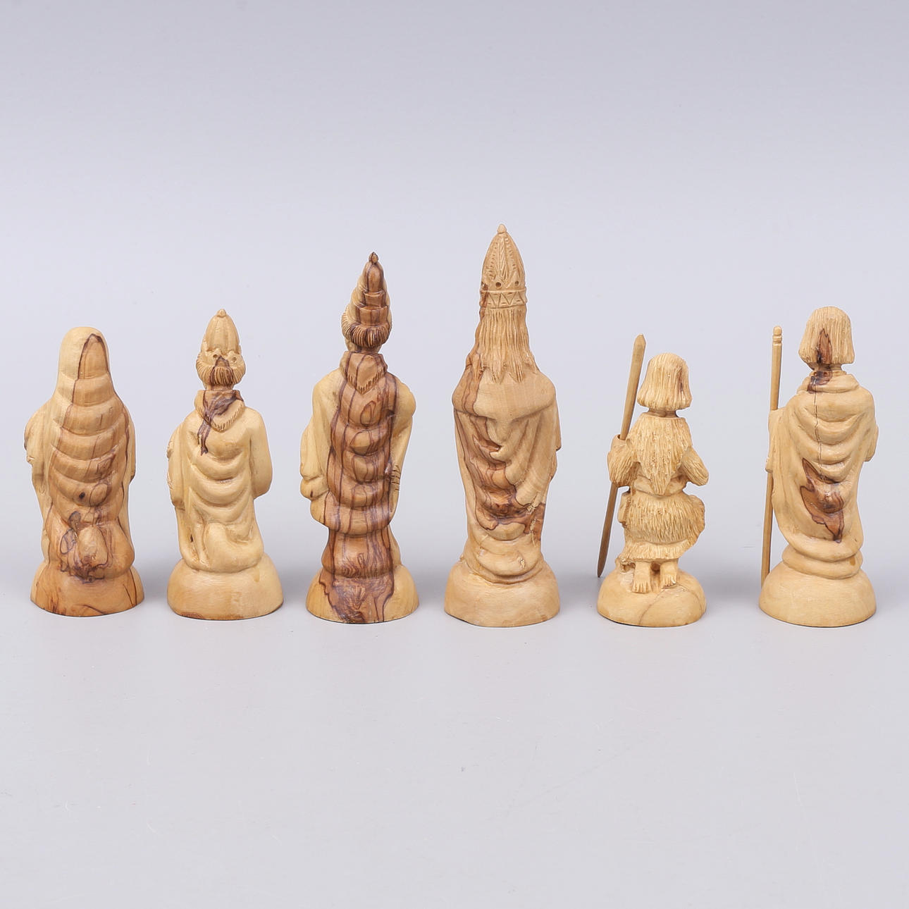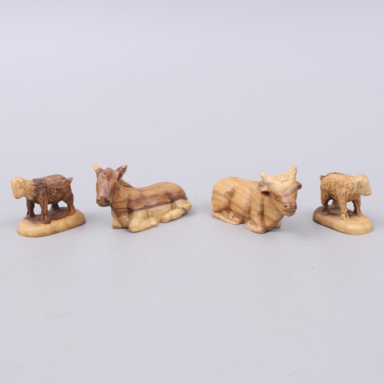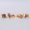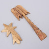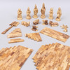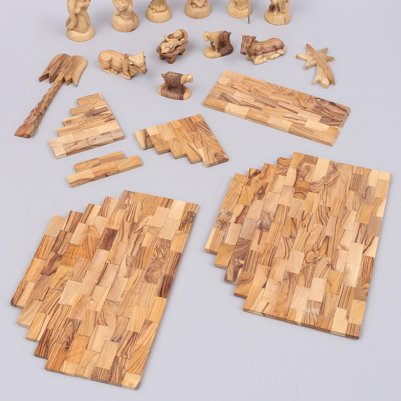 Krippe in Einzelteilen und 11 Figuren und Tieren sowie Palme und Stern.