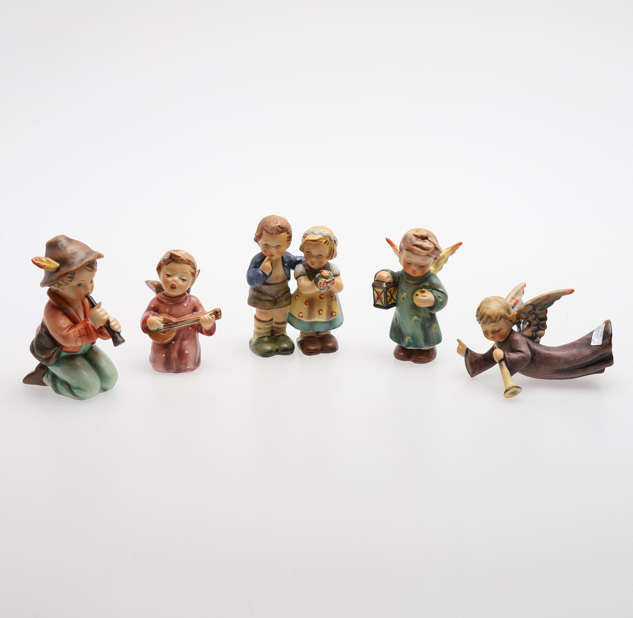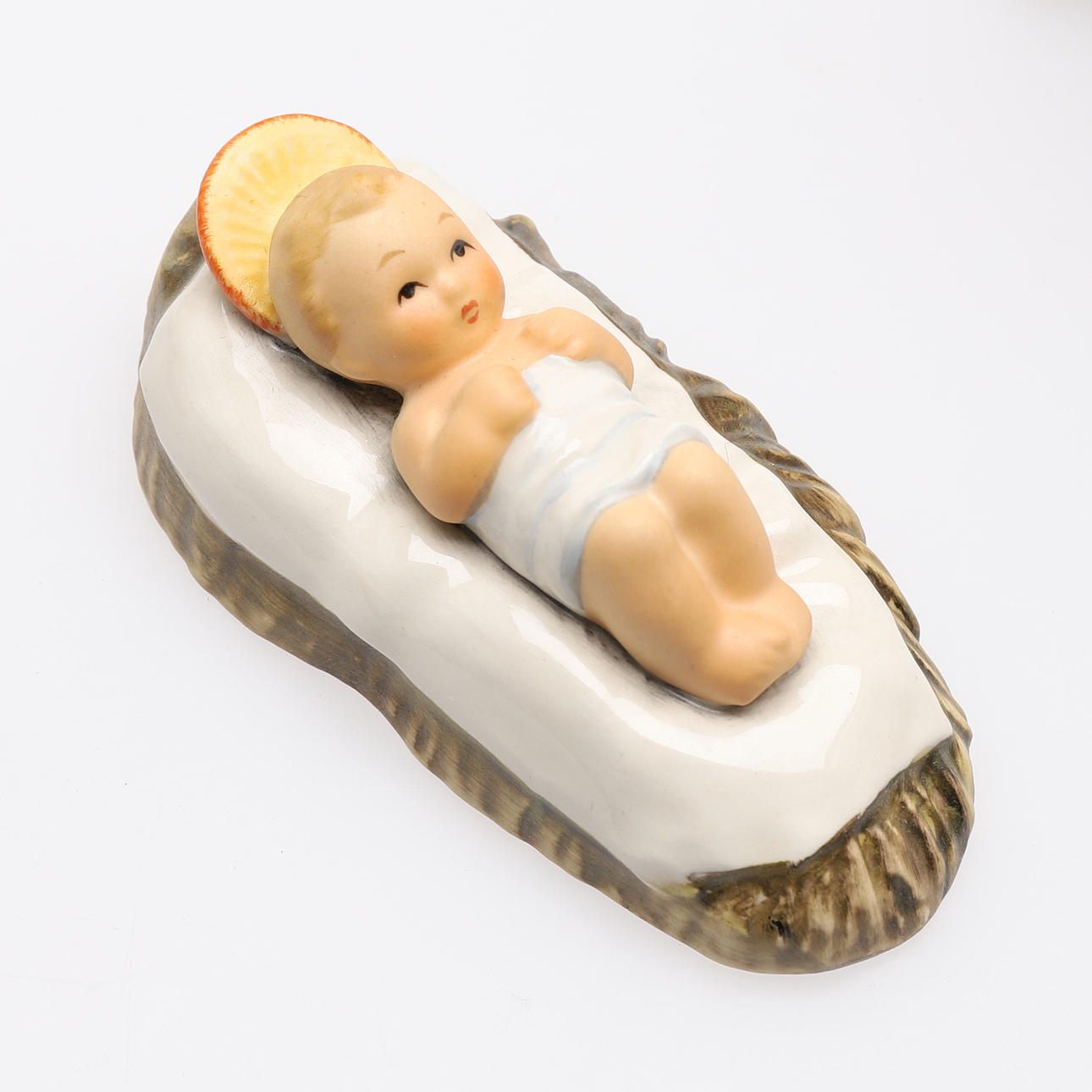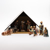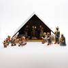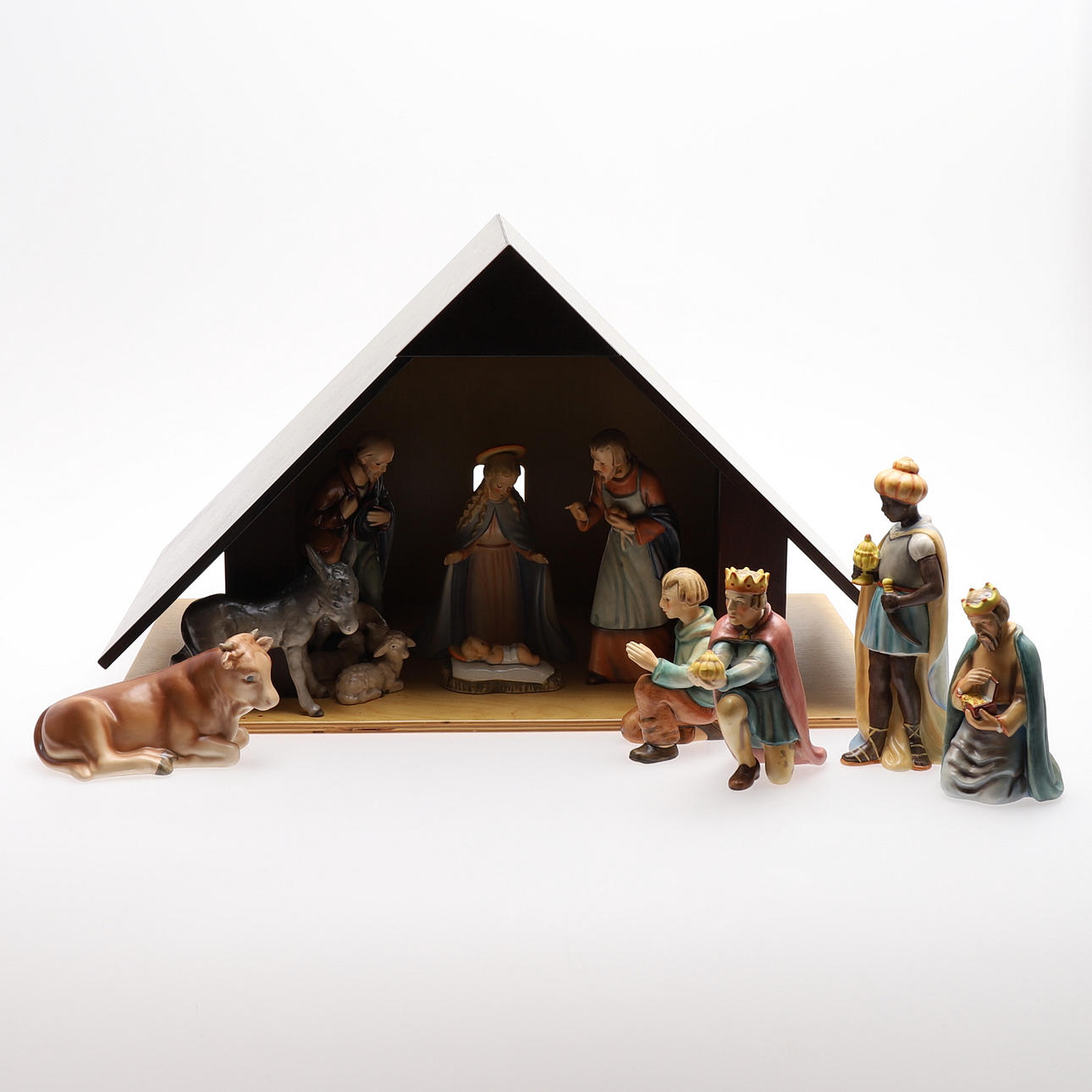 Jesuskind, Jungfrau Maria, Josef, 3 Weise, 2 Hirten, 1 Esel, 1 Kuh, 1 Lamm und 5 Kinder/Engel, Entwurf Maria Innocentia Hummel und Holzstall, zweite Hälfte 20. Jahrhundert, Höhe 34, Länge 55 und Tiefe 30 cm, Figurenhöhe 4-18 cm. Mit Kisten.