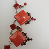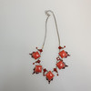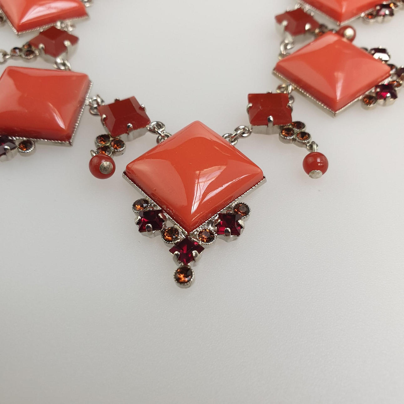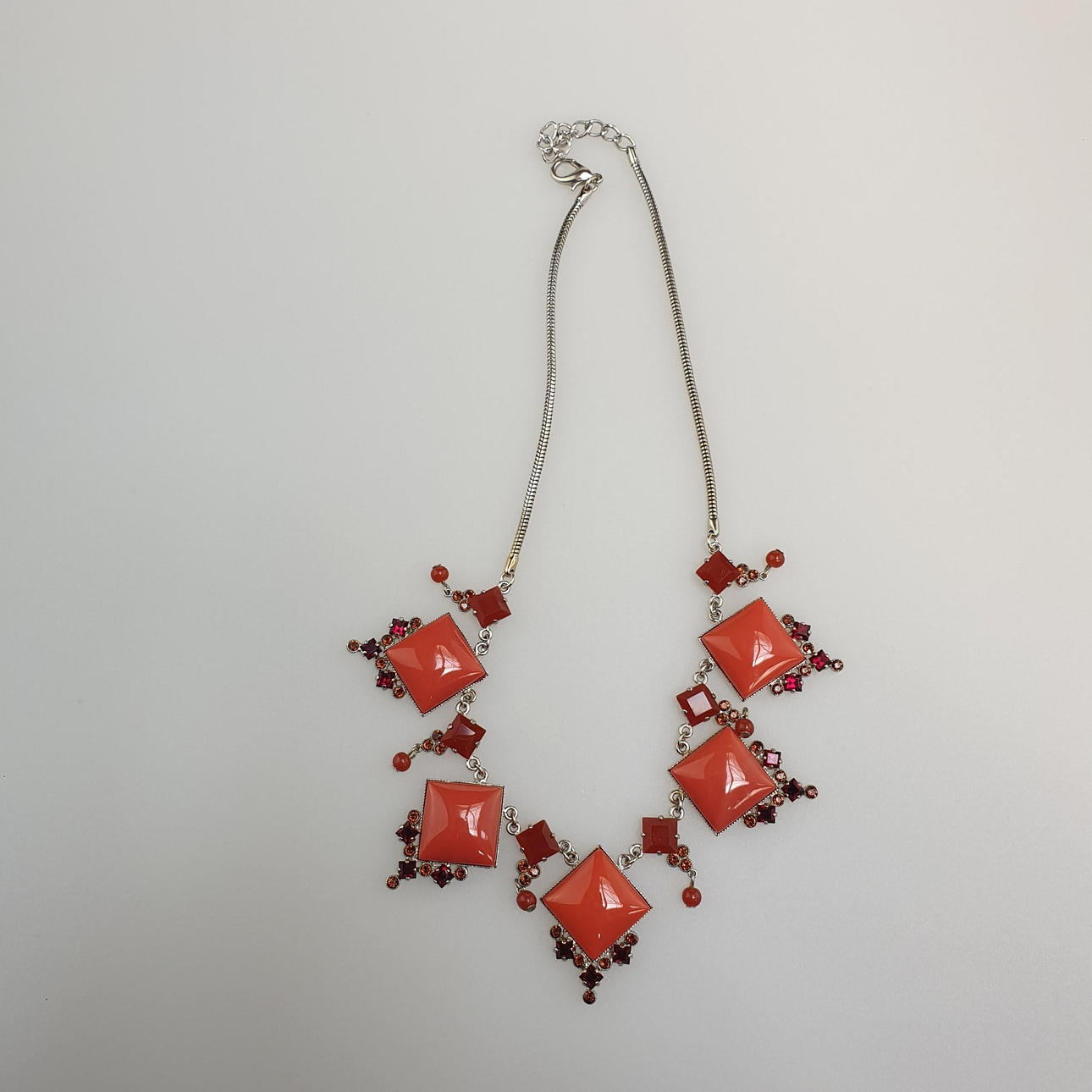 Weißbronze/Tombak, rhodiniert, Besatz mit unterschiedlich geformten Cabochons und Kristallen in diversen Rottönen, Swarovski-Steine bzw. Gablonz, Länge mit Verlängerungskettchen ca.46,5cm.