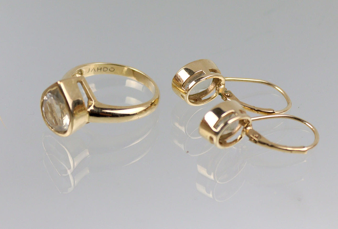 alle 3 Teile punziert Gelbgold 375 (9 Karat), ca. 7,4 Gramm, dabei Ring mit Orthoklas (Madagaskar) von ca. 10 x 8 mm ca. 1,83 ct. im Tropfenschliff in glatter Zarge besetzt, RG 54, InnenØ ca. 17,2 mm dazu ein Paar Ohrhänger mit großem Klappohrbügel, je mit einem Orthoklas (Madagaskar) von je ca. 10 x 8 mm zus. ca. 4,20 ct. im Ovalschliff in glatter Zarge besetzt, Länge ca. 26 mm, ges. 3 Teile mit 2 Schmuckzertifikaten.