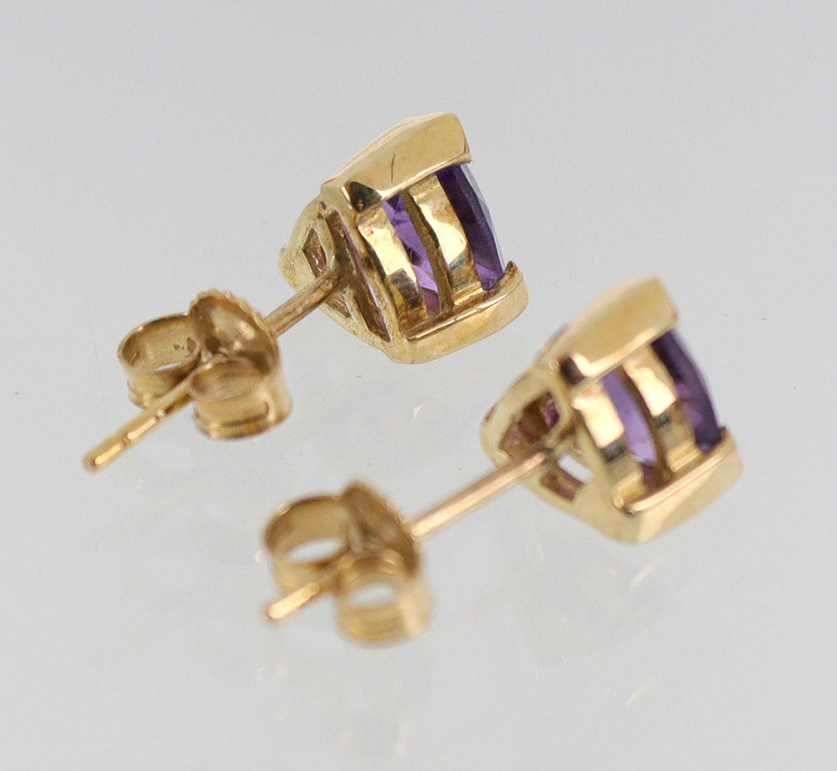 punziert Gelbgold 375 (9 Karat), ca. 1,5 Gramm, ein Paar Ohrstecker mit Sambia Amethyst von je ca. 6 mm zus. ca. 1,29 ct. im Trillantschliff besetzt, ges. 2 Stück, mit Schmuckzertifikat.