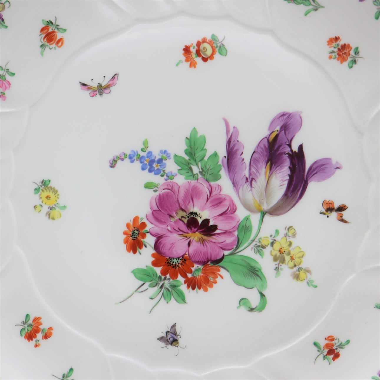 Meissen Schale, Porzellan, 1. Wahl, 1815-1919, mit Insekten & Streublümchen Dekor, Durchmesser: 29 cm.
