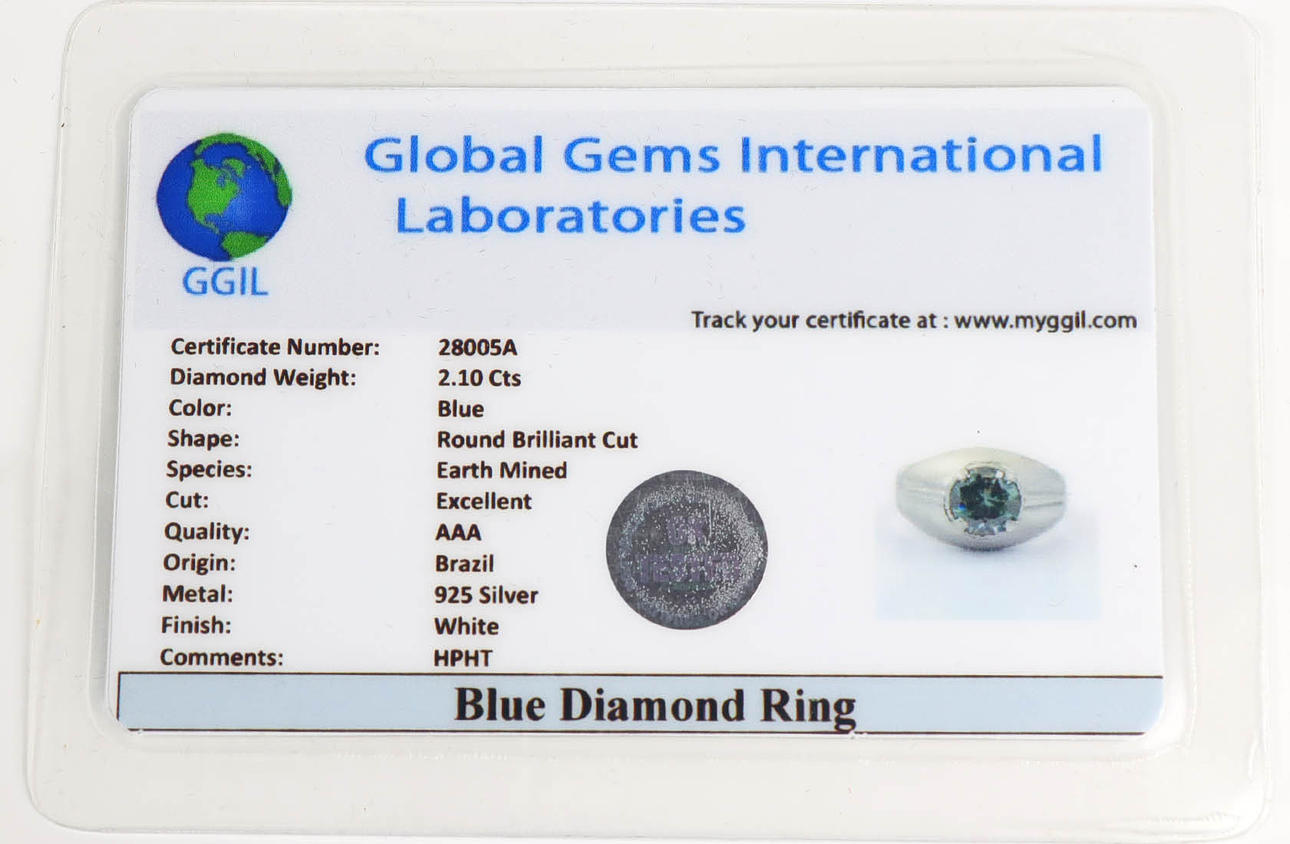 punziert 925, ca. 8,1 Gramm, erhöhter Ringkopf mit Blauem Diamant im Brillantschliff von ca. 2,01 ct. besetzt, RG 64, InnenØ ca. 20,4 mm, mit Laborzertifikat.