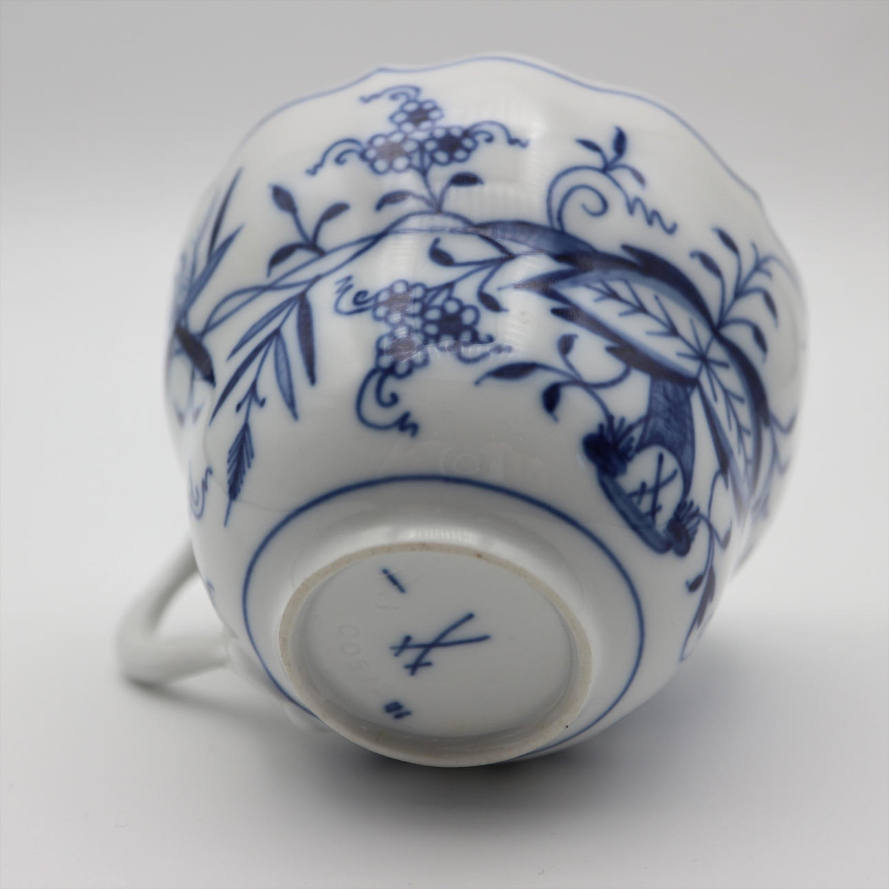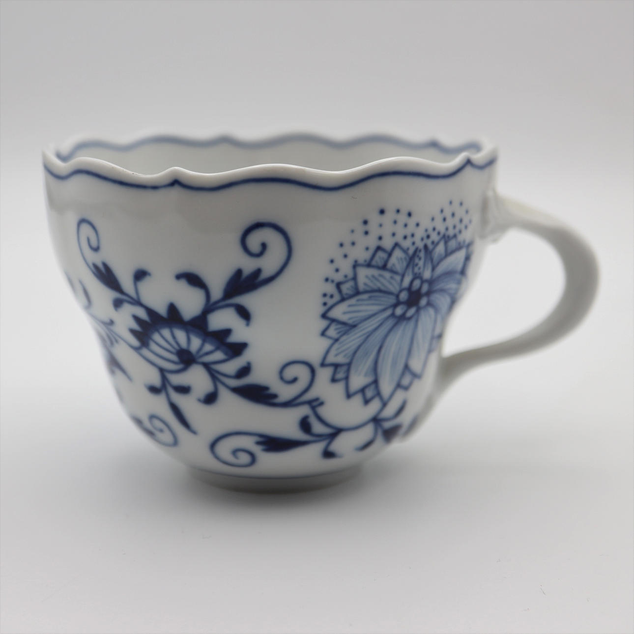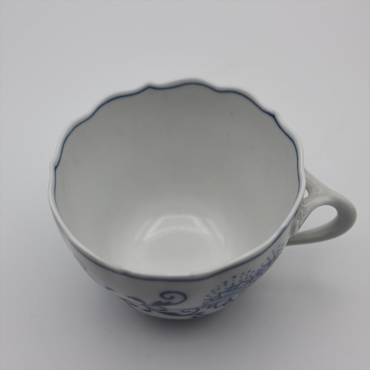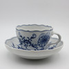 Meissen Tasse mit Unterteller, Porzellan, Zwiebelmuster, 2. Wahl, 20. Jahrhundert, Durchmesser Teller: 14 cm, Durchmesser Tasse: 8,5 cm.