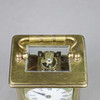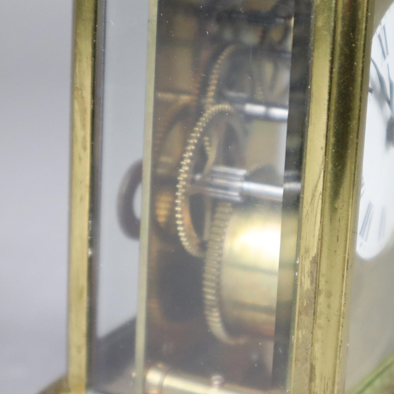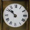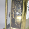zu 5 Seiten facettiert verglast, frontale Glasabdeckung lose und gechipt (untere linke Ecke), oben scharnierter Tragegriff, Emailzifferblatt mit römischen Ziffern, teils berieben, Werk bezeichnet "France", H.ca.11 cm ohne Griff gemessen.