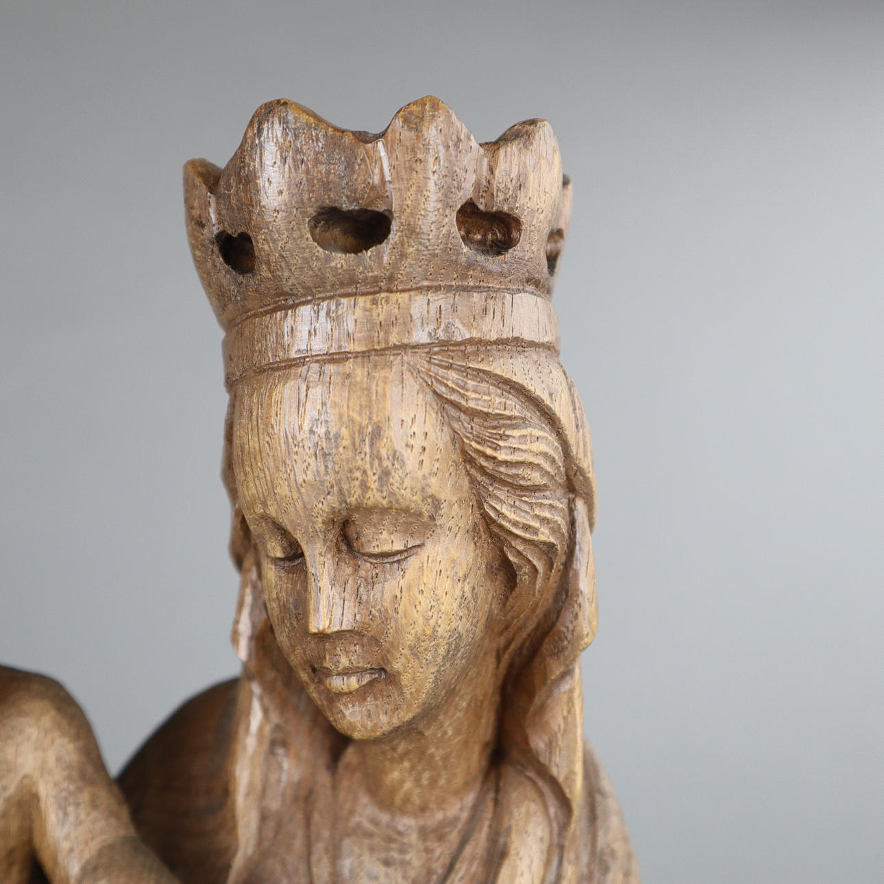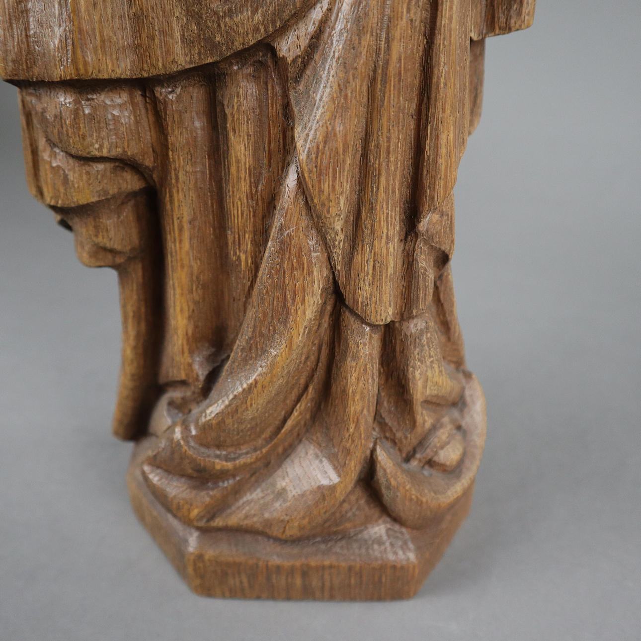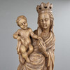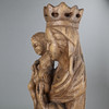 Lang sel. Erben, Oberammergau, 20.Jh., Holz, geschnitzt, braun gefasst, stehende bekrönte Muttergottes den Jesusknaben tragend, auf polygonalem Sockel, unterseitig Hersteller-Etikett, H.ca.57cm.