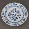 unterglasurblaue Schwertermarke mit Marcolini-Stern, 1774-1814, runder Teller mit glattem Rand, unterglasurblaues Zwiebelmuster, D.ca.24cm.