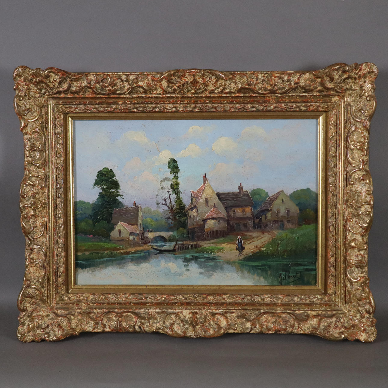 Gilbert -20.Jh.- Wasserträgerin vor einem alten Gehöft am Gewässer, Öl auf Karton, rechts unten signiert, ca. 24x34,5cm, Zierrahmung.