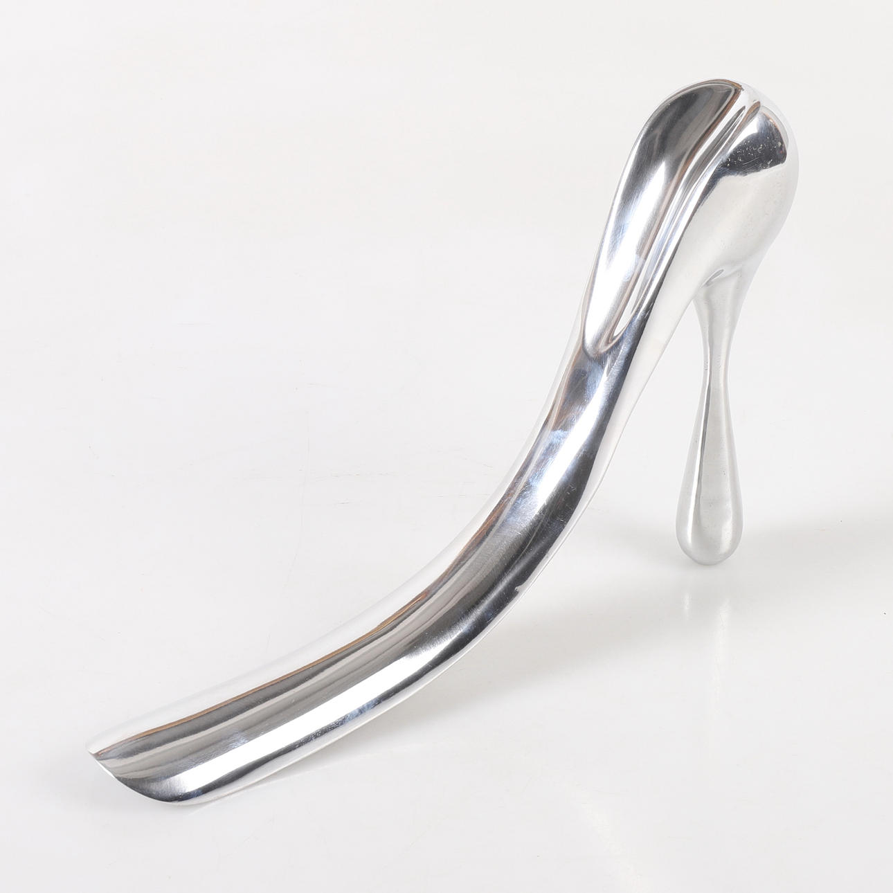 Manolo Blahnik, skulpturaler Schuhlöffel aus Weißmetall, entworfen in limitierter Auflage für Habitat. Höhe 18cm Länge 31cm.