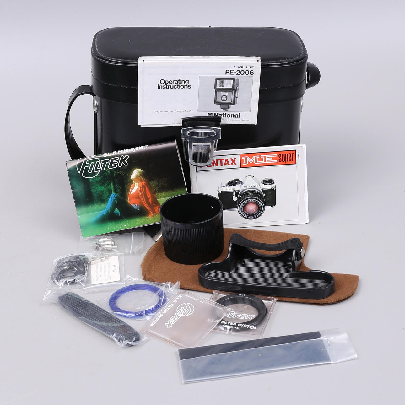 Koffer, Bedienungsanleitung, Blitzgerät National, Objektiv Asahi 1:2,5 mm, Kamerastativ Traveler 2, Objektiv Soligor.