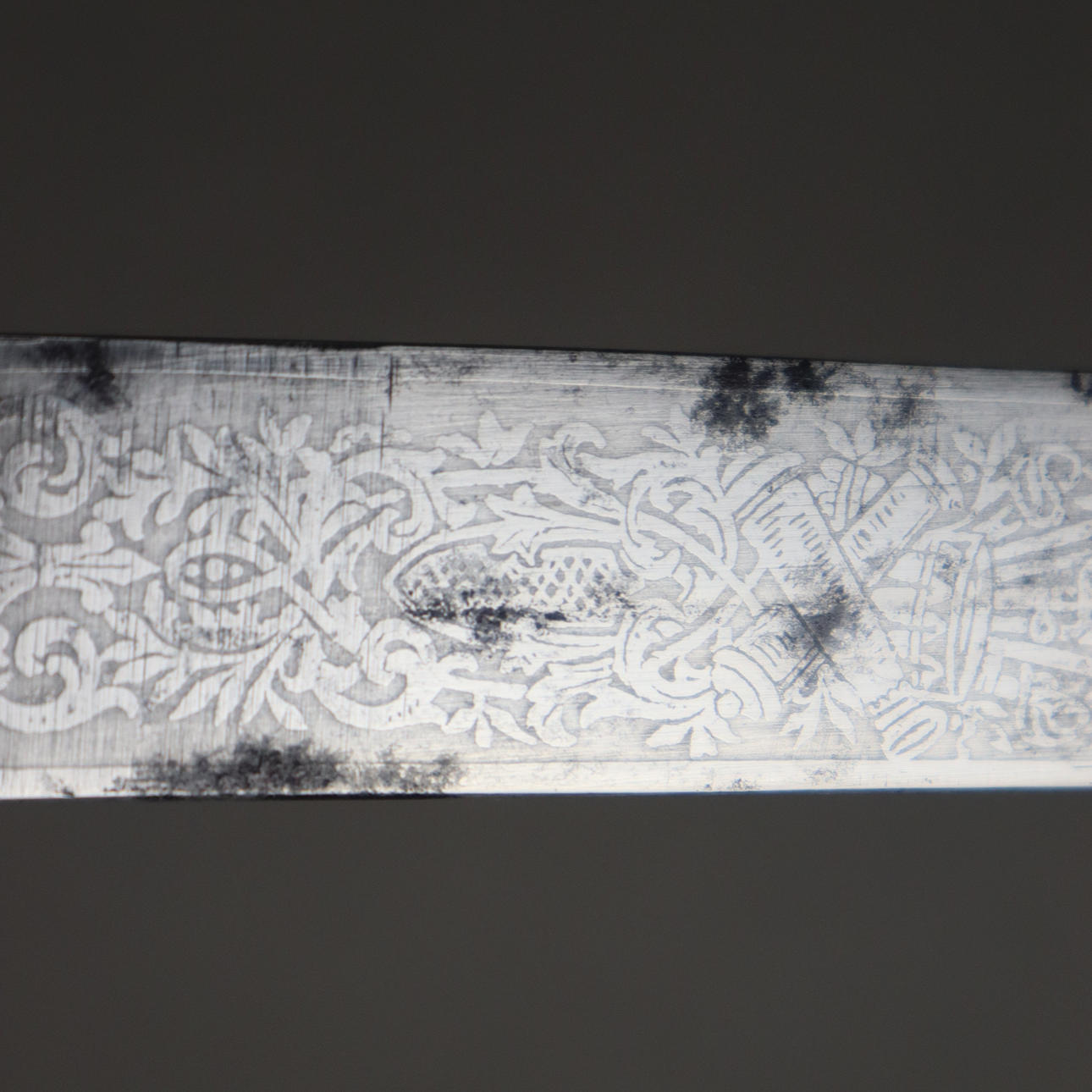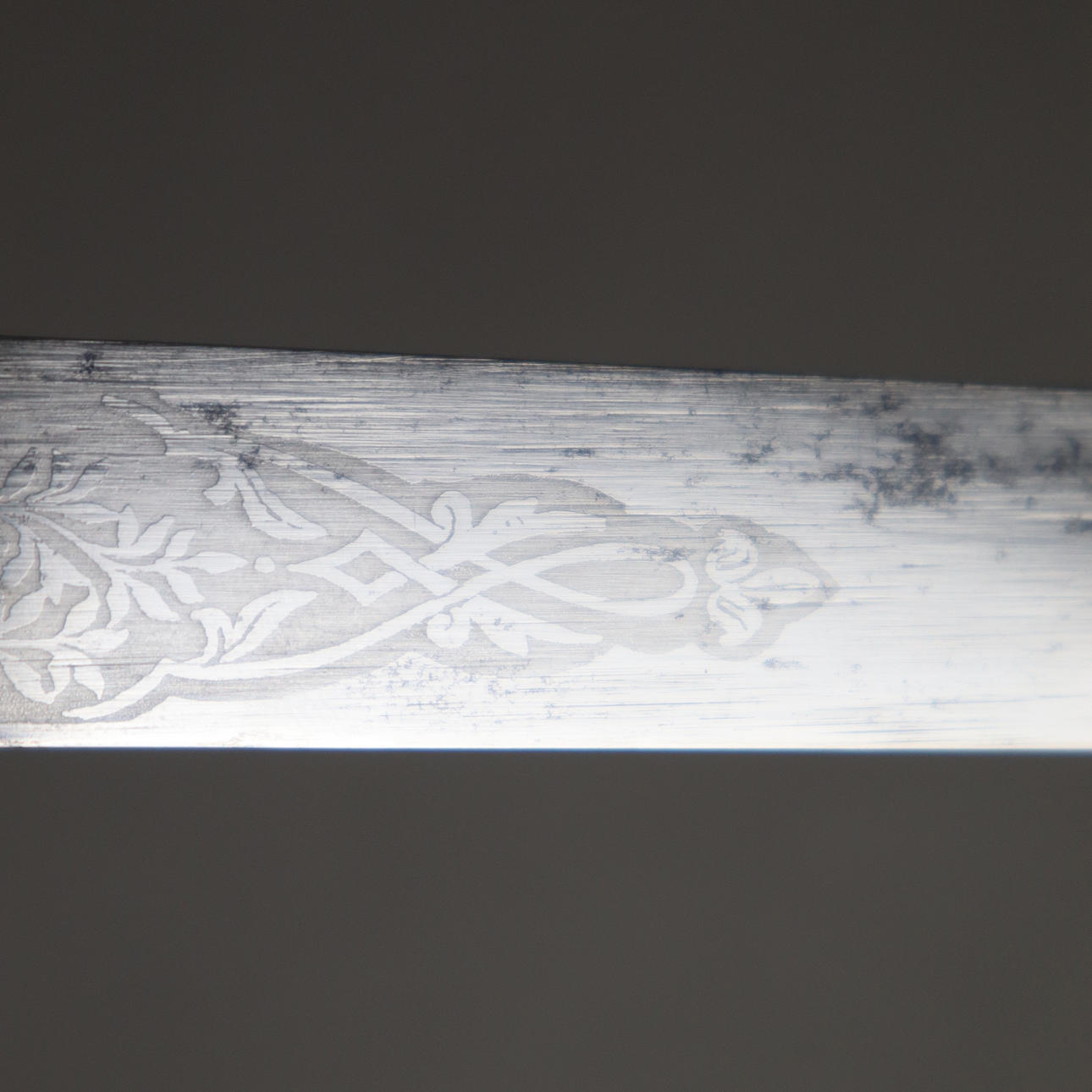 ohne Hersteller, ziselierte Klinge, Lederscheide mit Messingbeschlägen, Klinge ca.47cm, Gesamtlänge (ohne Scheide gemessen) ca.58cm.