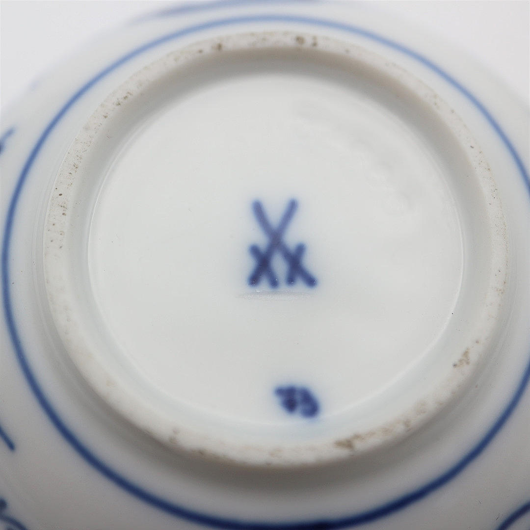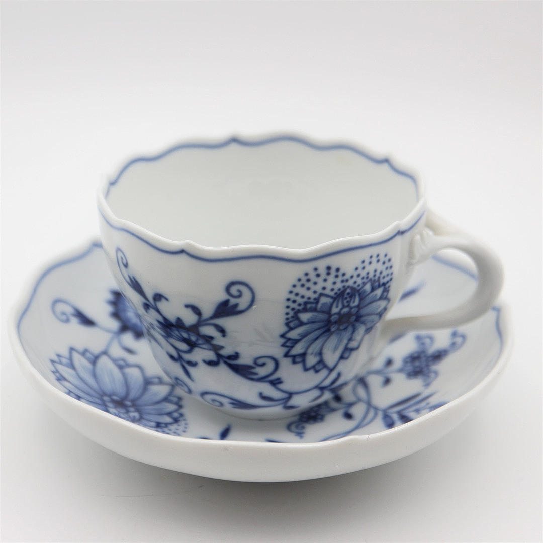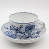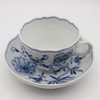 Meissen Tasse mit Unterteller, Porzellan, Zwiebelmuster, 2. Wahl, 20. Jahrhundert, Durchmesser Teller: 14 cm, Durchmesser Tasse: 8,5 cm.