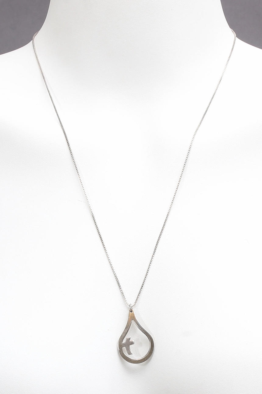 Hängender Silbertropfen (Tauftropfen), Schwedische Kirche, Sporrong. Länge des Anhängers ca. 3,5 cm, Länge der Kette ca. 56 cm.