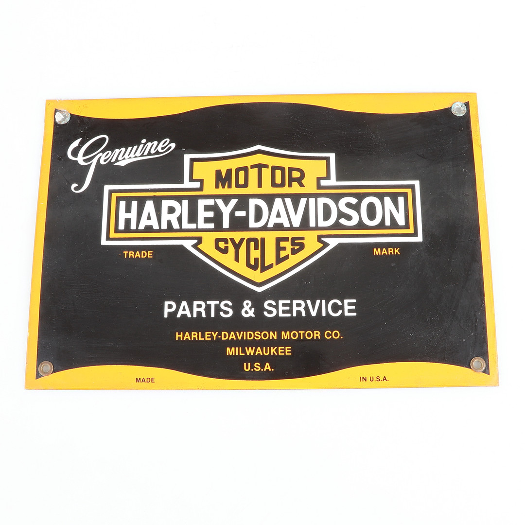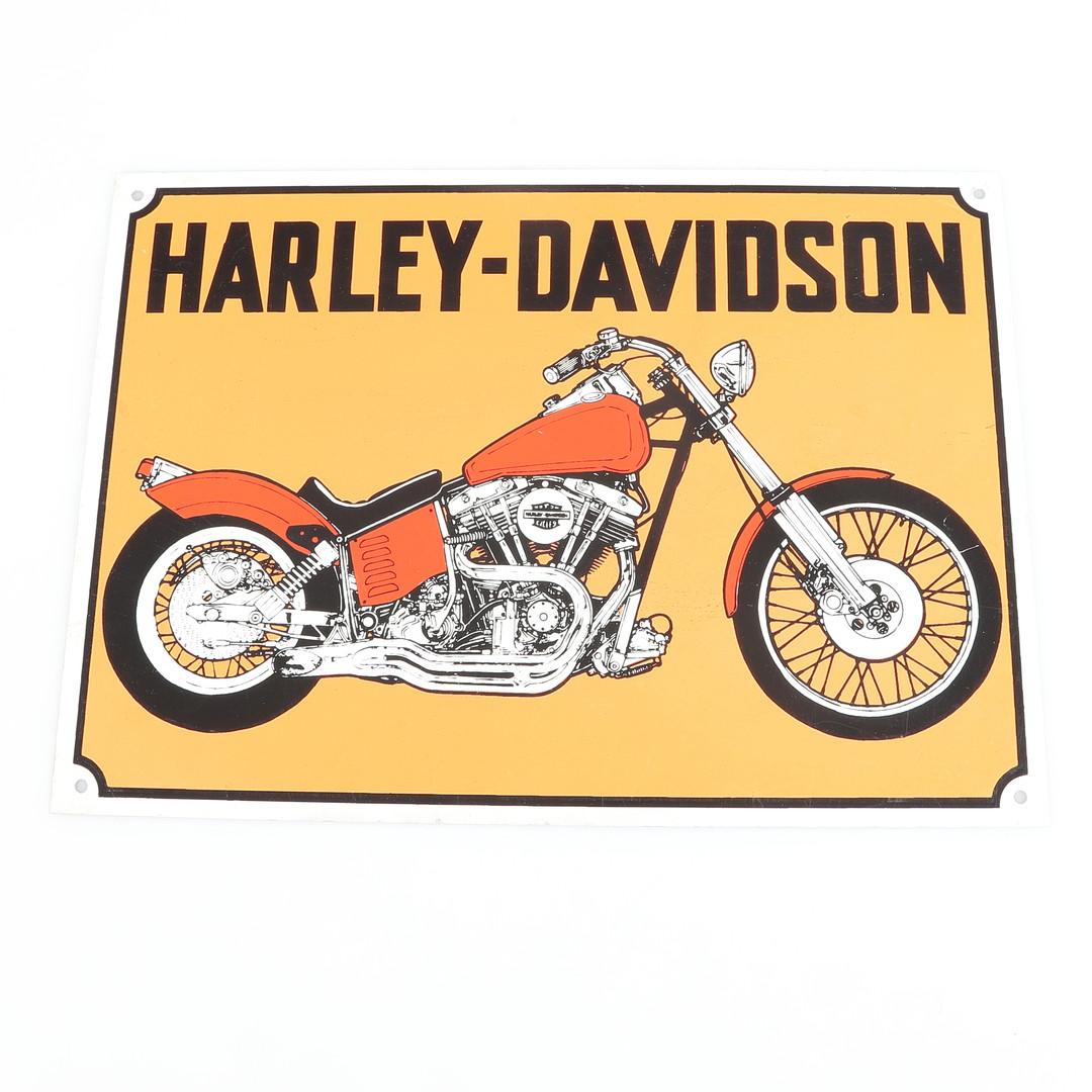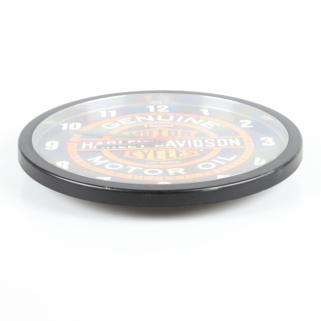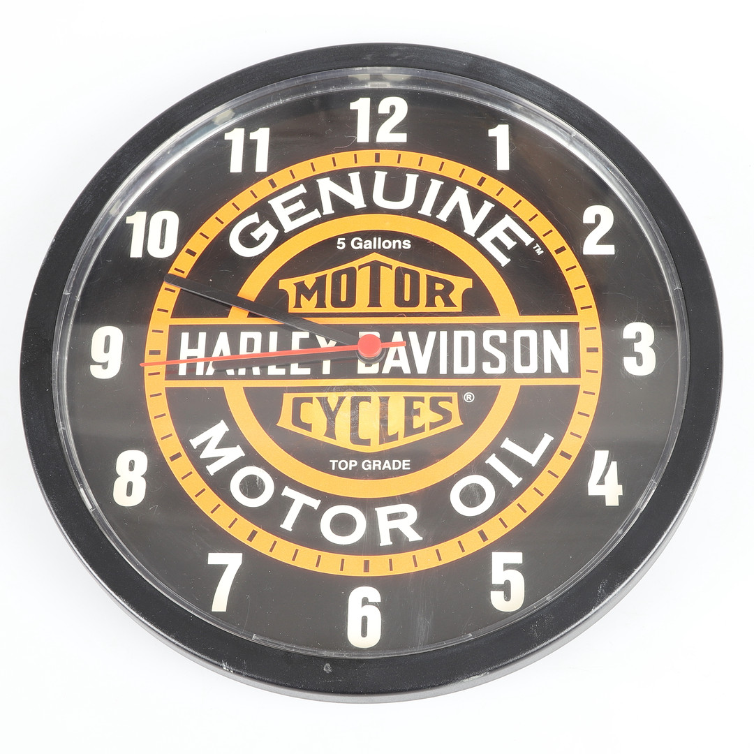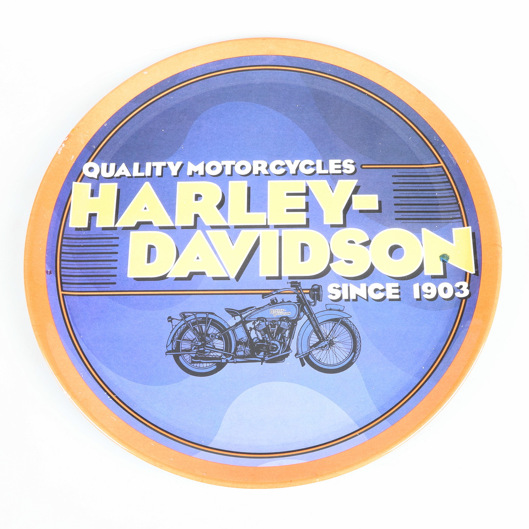 1577161. HARLEY DAVIDSON, Schilder, Wanduhr und Tablett, 5 Teile.