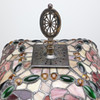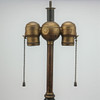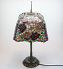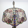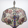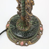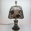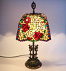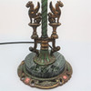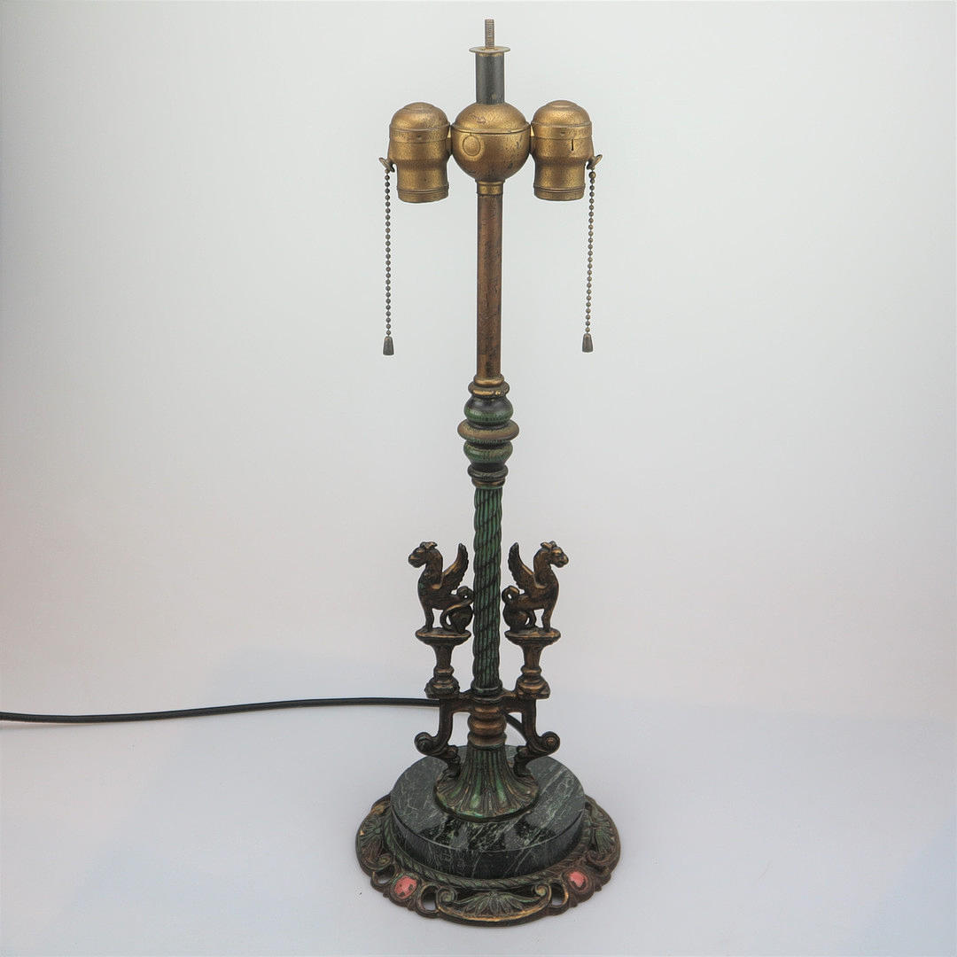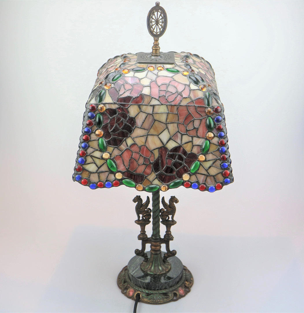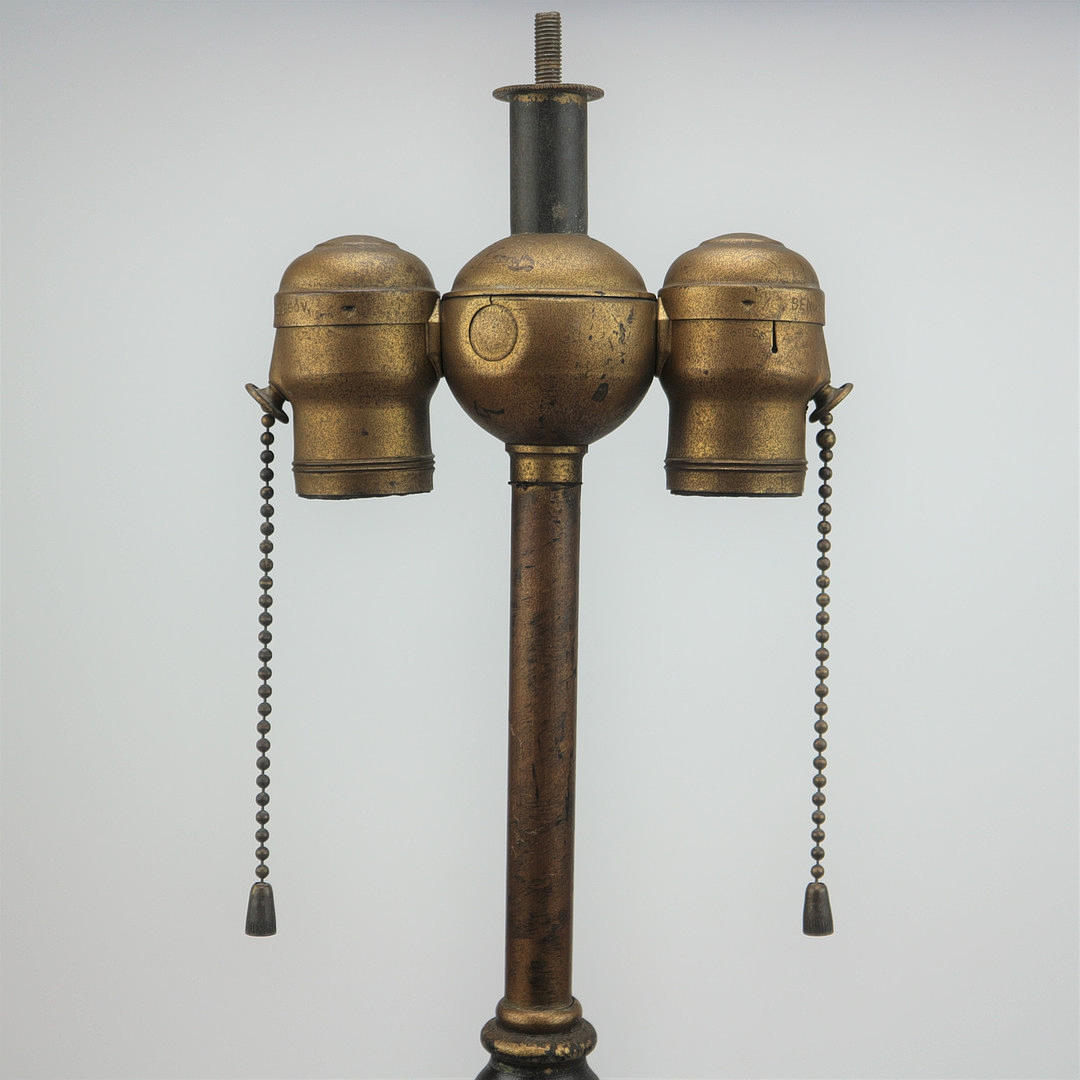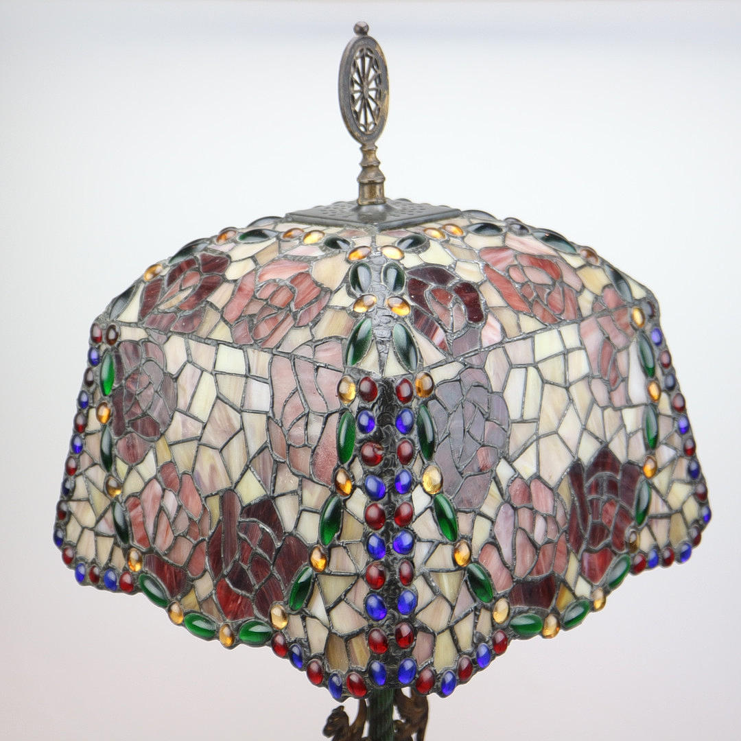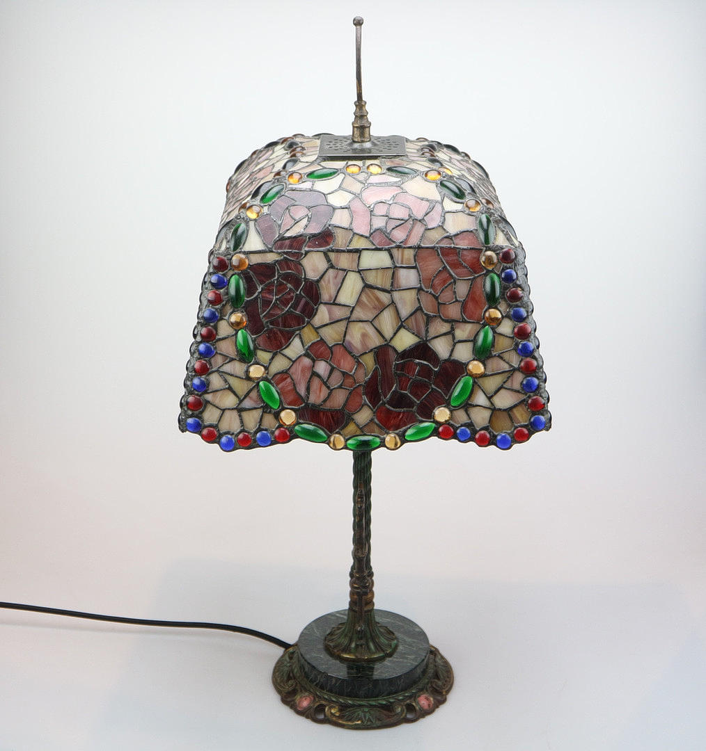 Antiker Schirm und Fuß im Tiffany-Stil, zweiflammig, opalin, marmorierte Glasscheiben, Bleiverglasung, Rosendeko, Eisenfuß mit Marmorplatte und Eißenverzierung, bemalt, elektrifiziert, um 1900.