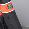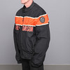 Gefütterte Windjacke aus schwarzem Textil, Harley Davidson Emblem in Orange und Weiß.
