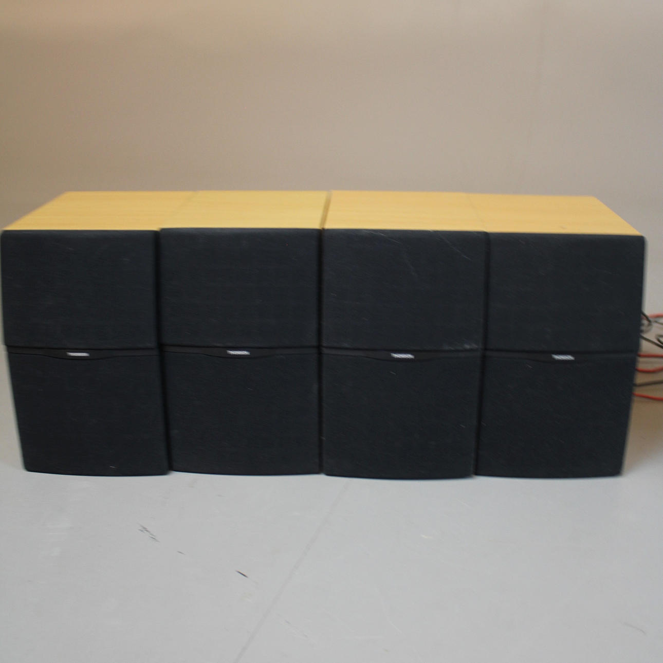Subwoofer, Center und 4 Satellitenlautsprecher mit Fernbedienung.