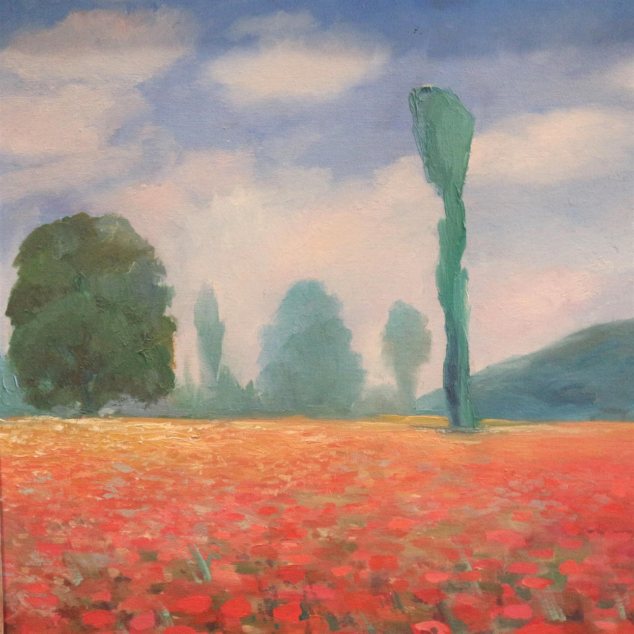 Öl auf Leinwand, Impressionistische Landschaft mit Mohn, im handgeschnitzem Holzrahmen monogrammiert, Bildmaße: 51 x 61 cm, Rahmenmaße: 67 x 77 cm.