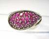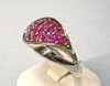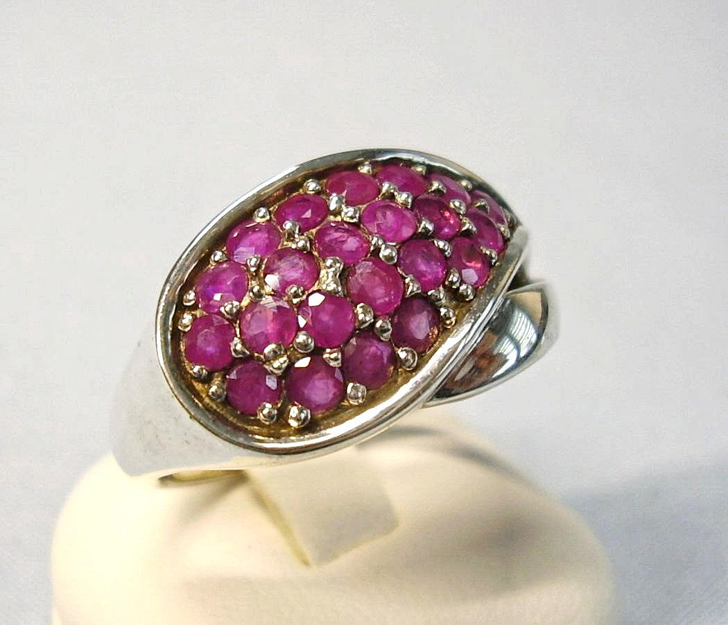 Der geschwungene Ringkopf ist besetzt mit 22 rund facettierten Natur-Rubinen von zusammen 2 ct.