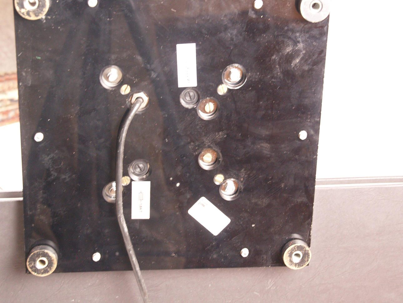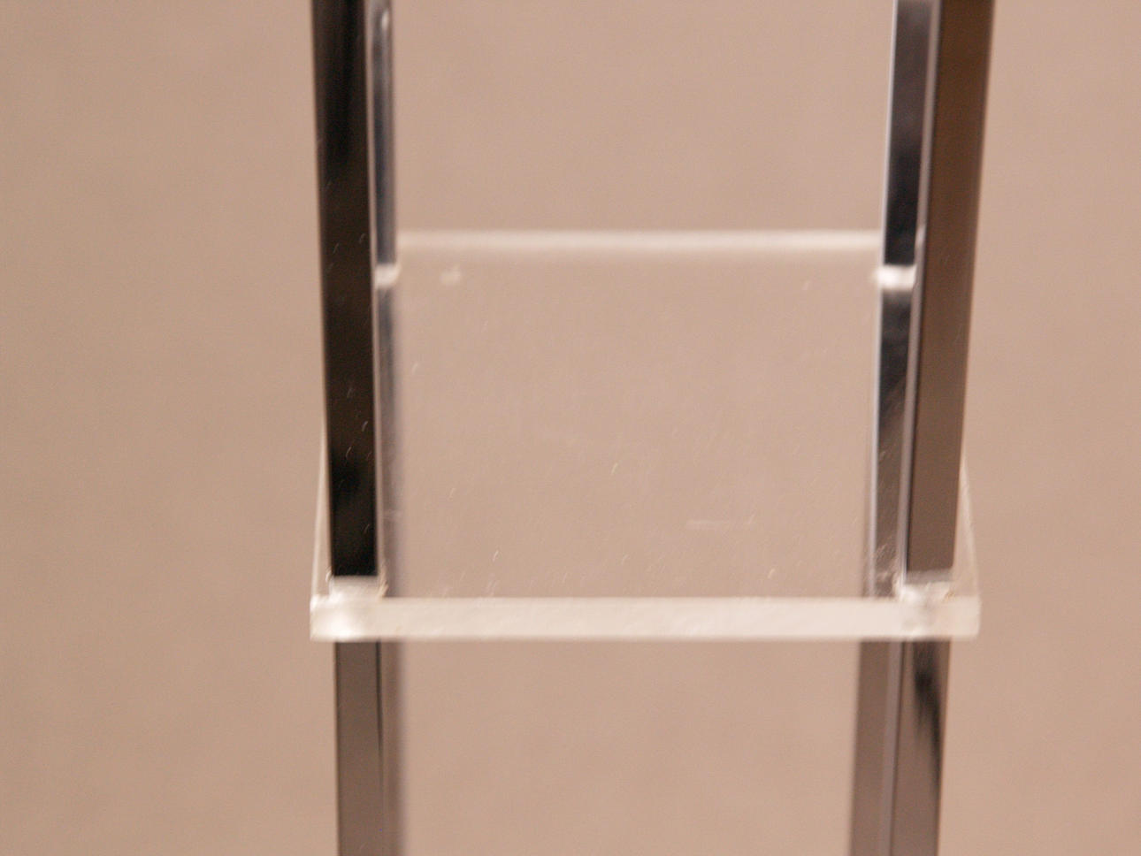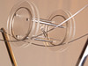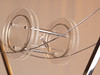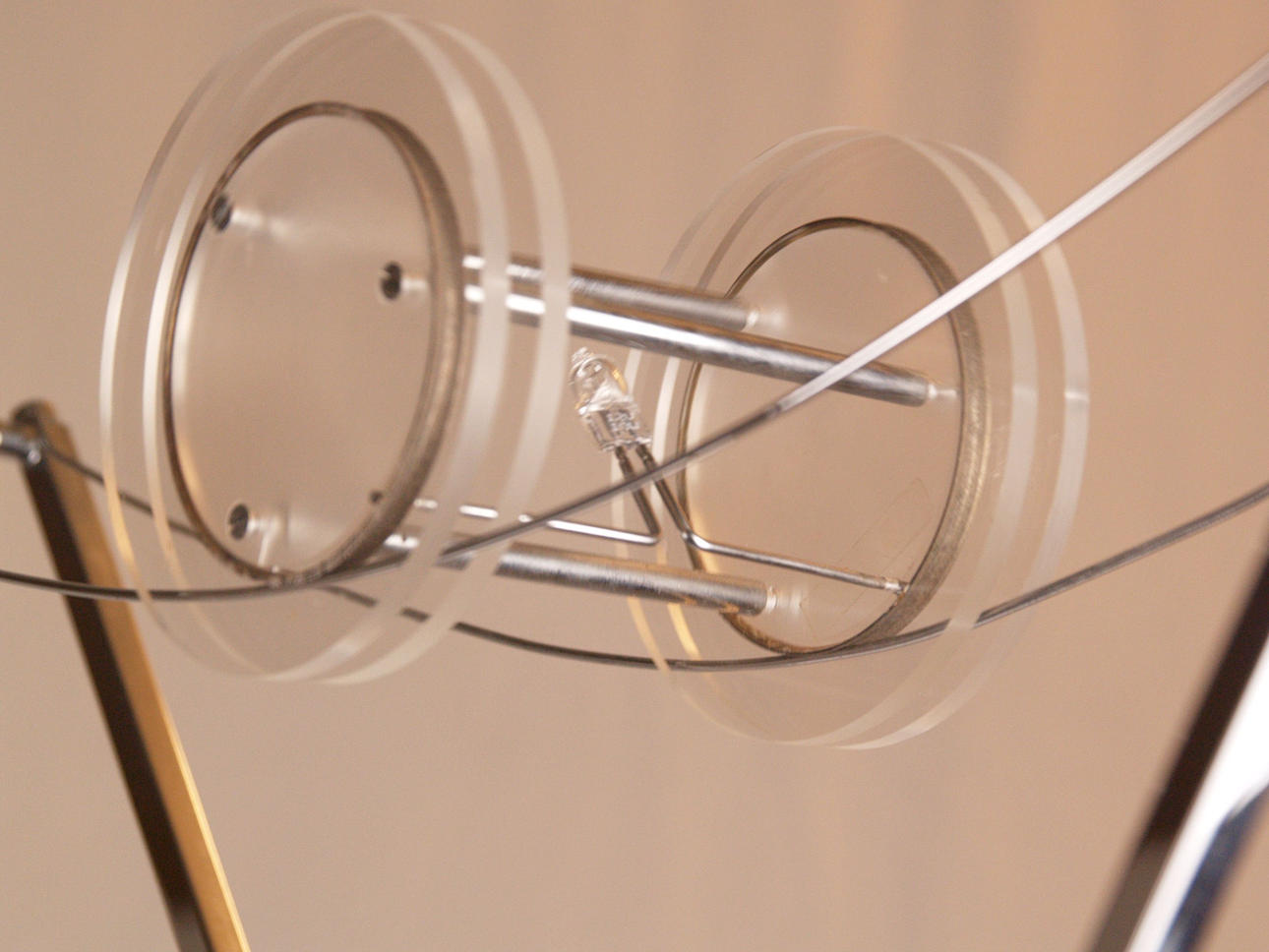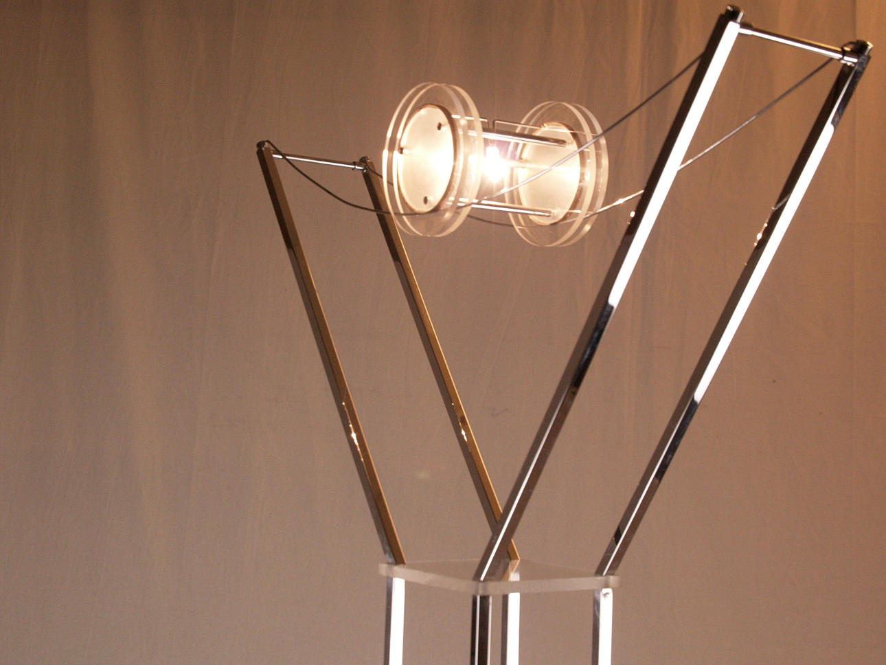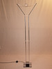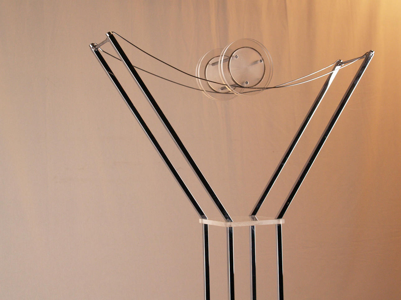 verchromtes Metall/Kunststoff, hohes Gestell auf viereckigem Stand, oben Gabelung mit gespannten Drähten und Spule aus Kunststoff, elektrifiziert, H.ca.187cm.