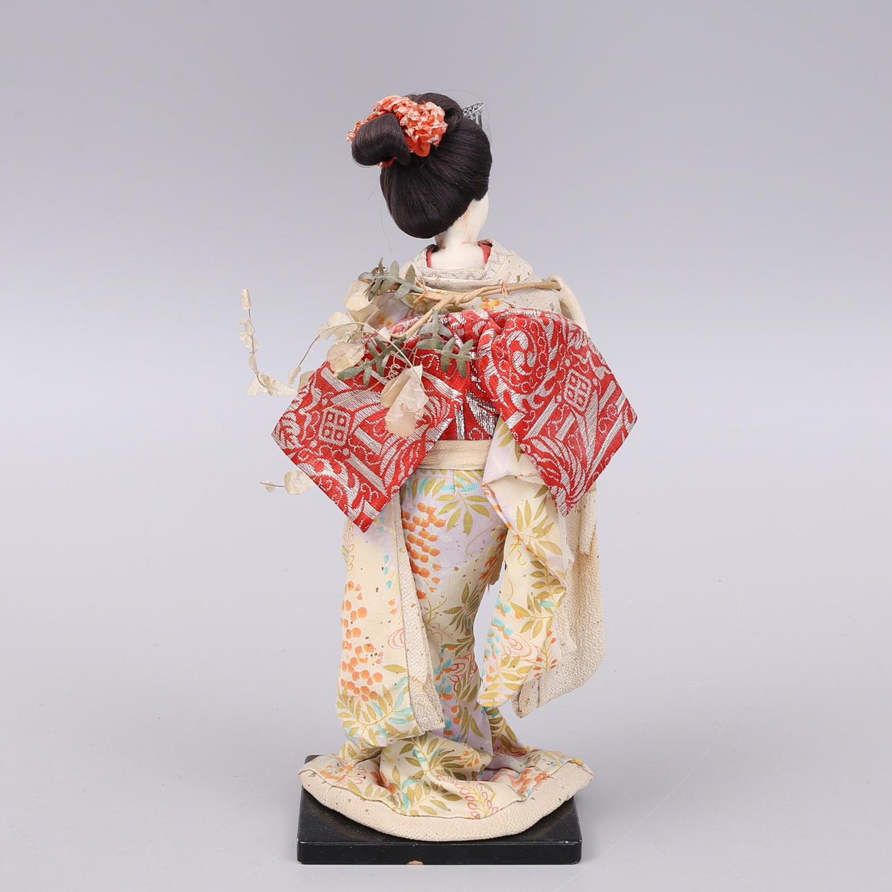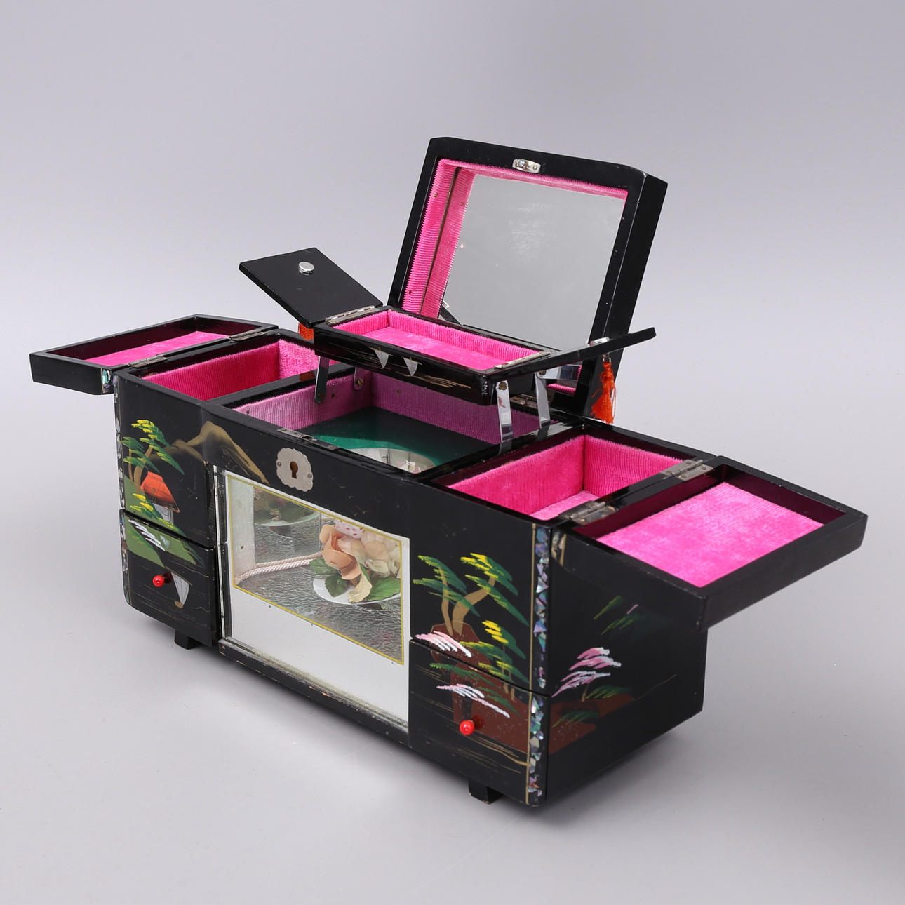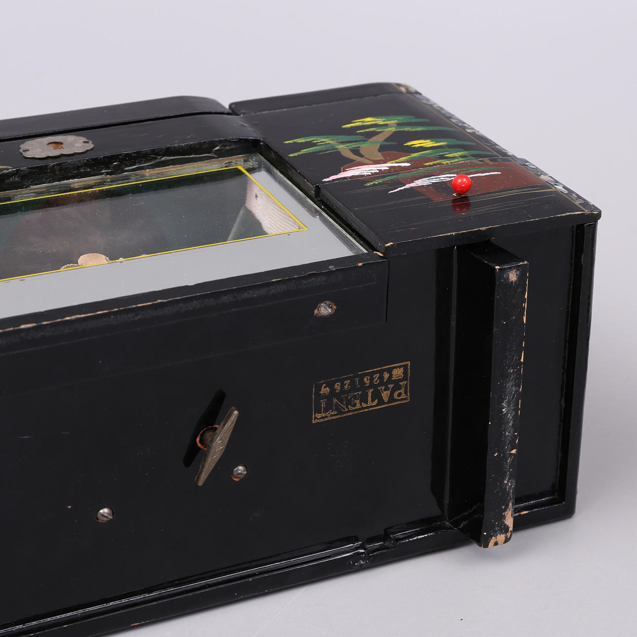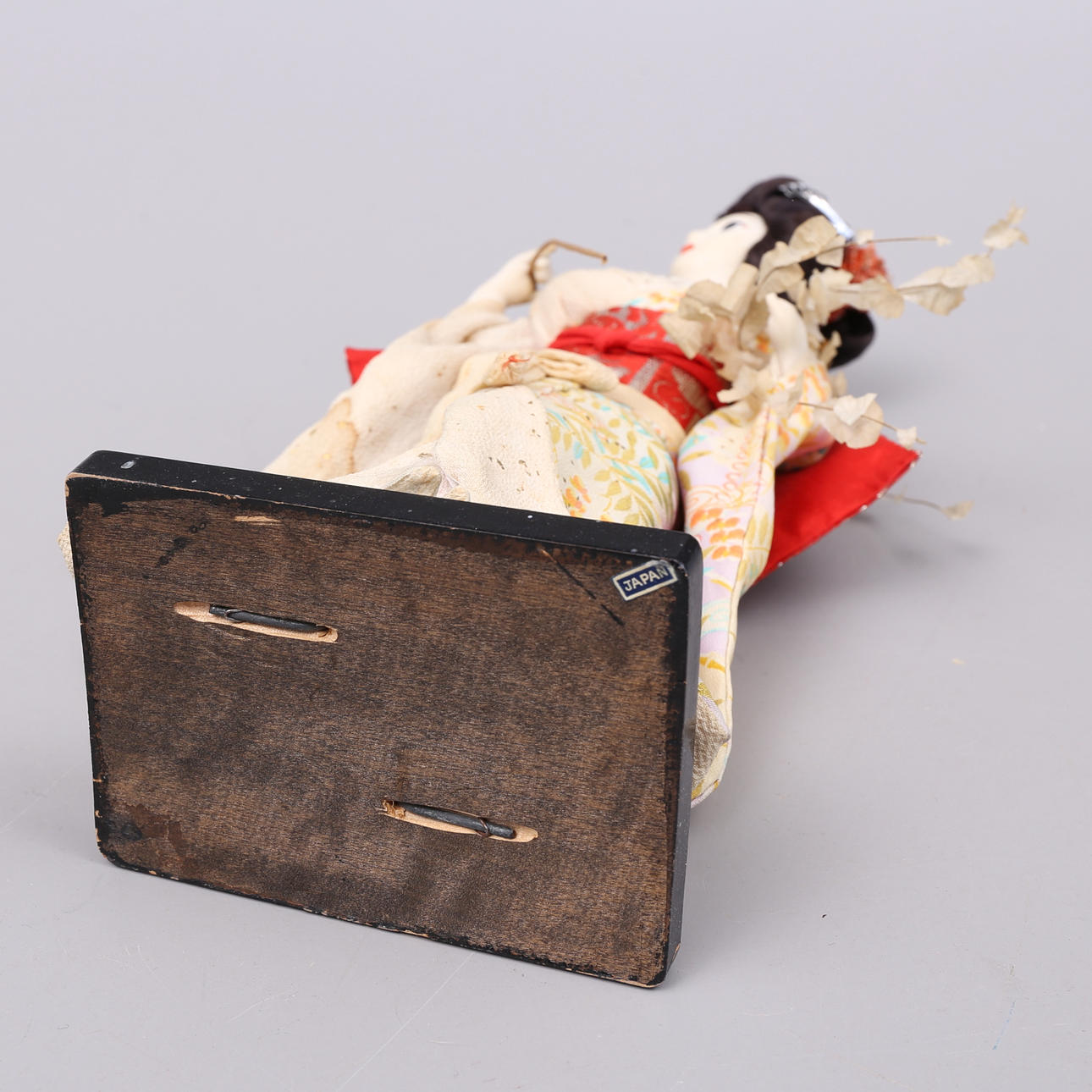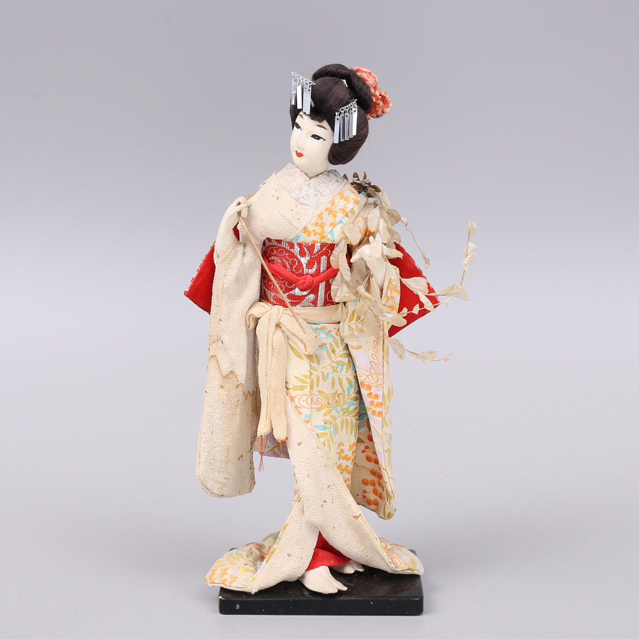 Schmuckkästchen/Lackkästchen mit Spieluhr, Höhe 18,5, Breite 32, Tiefe 13 cm. Puppe, Geisha, Japan, Höhe 33 cm.