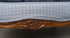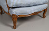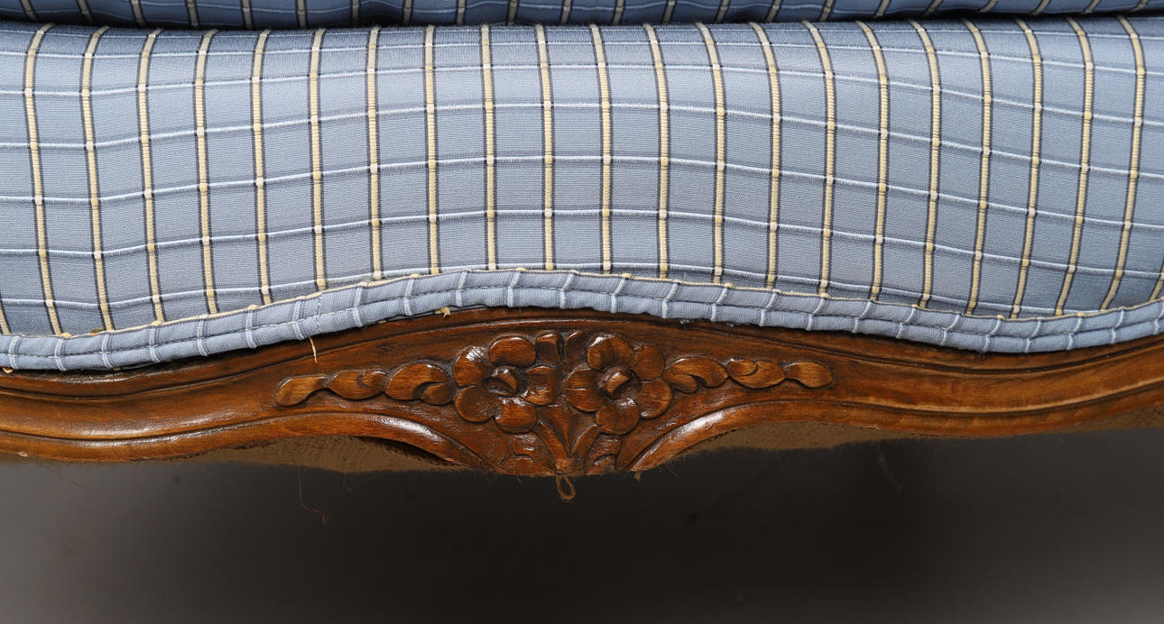Der Sessel mit geformtem Rahmen mit floralen Schnitzereien, auf Cabriole-Beinen, mit blau kariertem Stoff bezogen, 90 cm hoch x 83 cm breit x 77 cm tief.