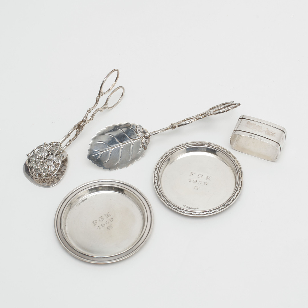 1635334. SILBEROBJEKTE, 42 Stück. Gewicht 700 Gramm.