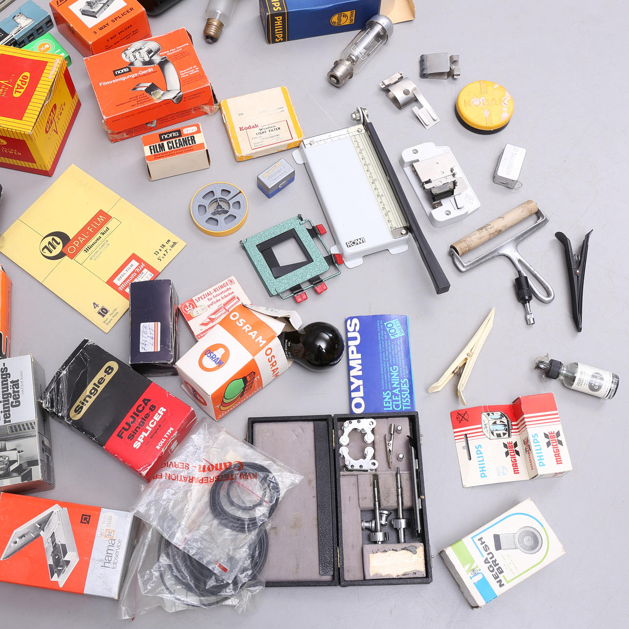 Ein Umzugskarton voller Entwicklungsschalen, Uniprint-Entwicklungsgerät, Aufhängehalterung, Dunkelkammerlampen, Filmschneidegeräten, Entwicklungsbox, Diabetes-Extraktor, elektrischem Trocknungsgerät usw.