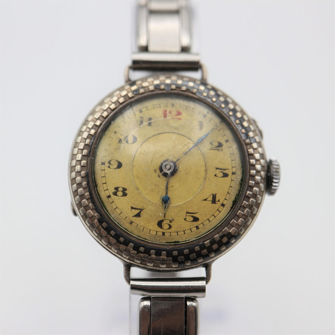 um 1910, 800 Silber, Nielloarbeit an der Lünette, Zifferblatt in Champagner Farben, mit Flexarmband, Gehäusedurchmesser ohne Krone: 27 mm.