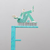 Mann liegt auf Nagelmatte auf dem Buchstaben F und raucht Zigarette. Bemaltes Holz, Pappe und Metall. Höhe ca. 60 cm.